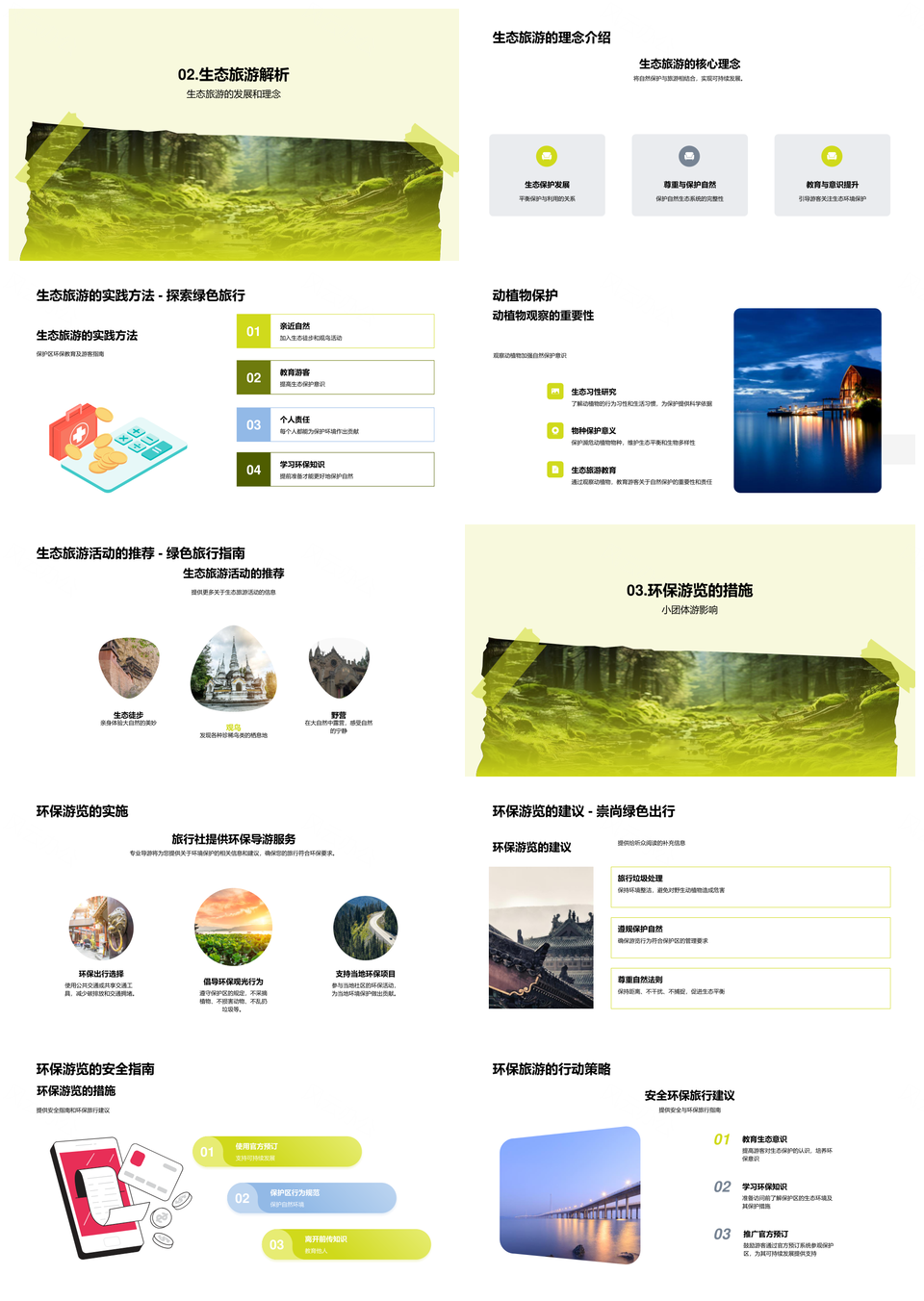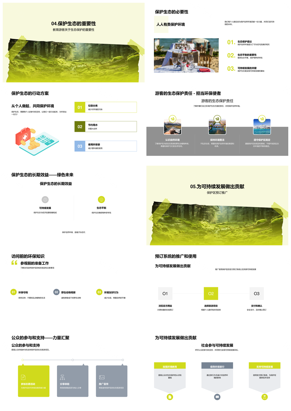 这是一张生态旅游环保实践促进保护区可持续发展PPT模板,包含生态旅游、环保实践、保护区、可持续发展等主题内容,也可用作生态旅游环保实践促进、生态旅游环保实践促进保护区、环保实践促进保护区可持续发展、生态旅游促进保护区可持续发展、生态旅游环保实践保护区、实践促进保护区可持续发展、环保促进保护区可持续发展、生态旅游环保促进保护、生态旅游环保实践保护、实践促进保护区可持续、促进保护区可持续发展、生态旅游环保实践、环保实践促进保护、保护区可持续发展、可持续发展促进保护等PPT场景使用。 风云办公提供的生态旅游环保实践促进保护区可持续发展PPT模板,下载格式为pptx,一共28页,作品中文字及图均可以修改和编辑,图片更改请在作品中右键图片并更换,文字修改请直接点击文字进行修改。