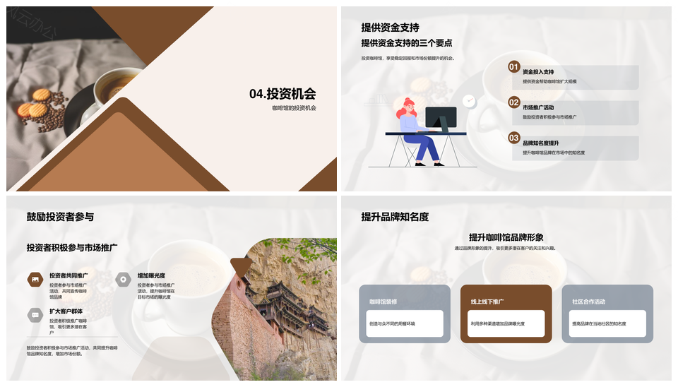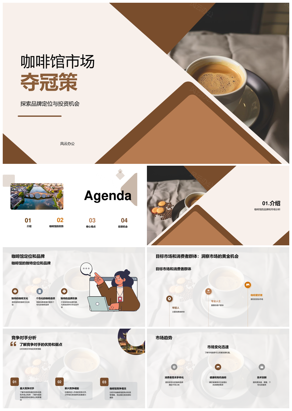 风云办公提供的咖啡馆市场竞争优势定位品牌战略PPT模板,下载格式为pptx,一共22页,作品中文字及图均可以修改和编辑,图片更改请在作品中右键图片并更换,文字修改请直接点击文字进行修改。