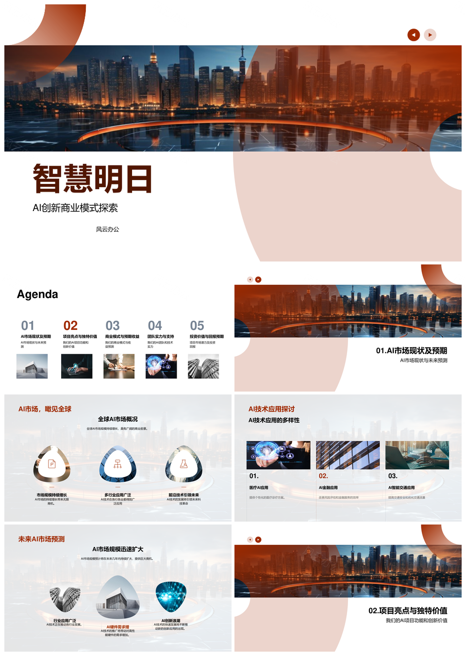 风云办公提供的全球AI市场技术创新与商业模式预测PPT模板,下载格式为pptx,一共23页,作品中文字及图均可以修改和编辑,图片更改请在作品中右键图片并更换,文字修改请直接点击文字进行修改。