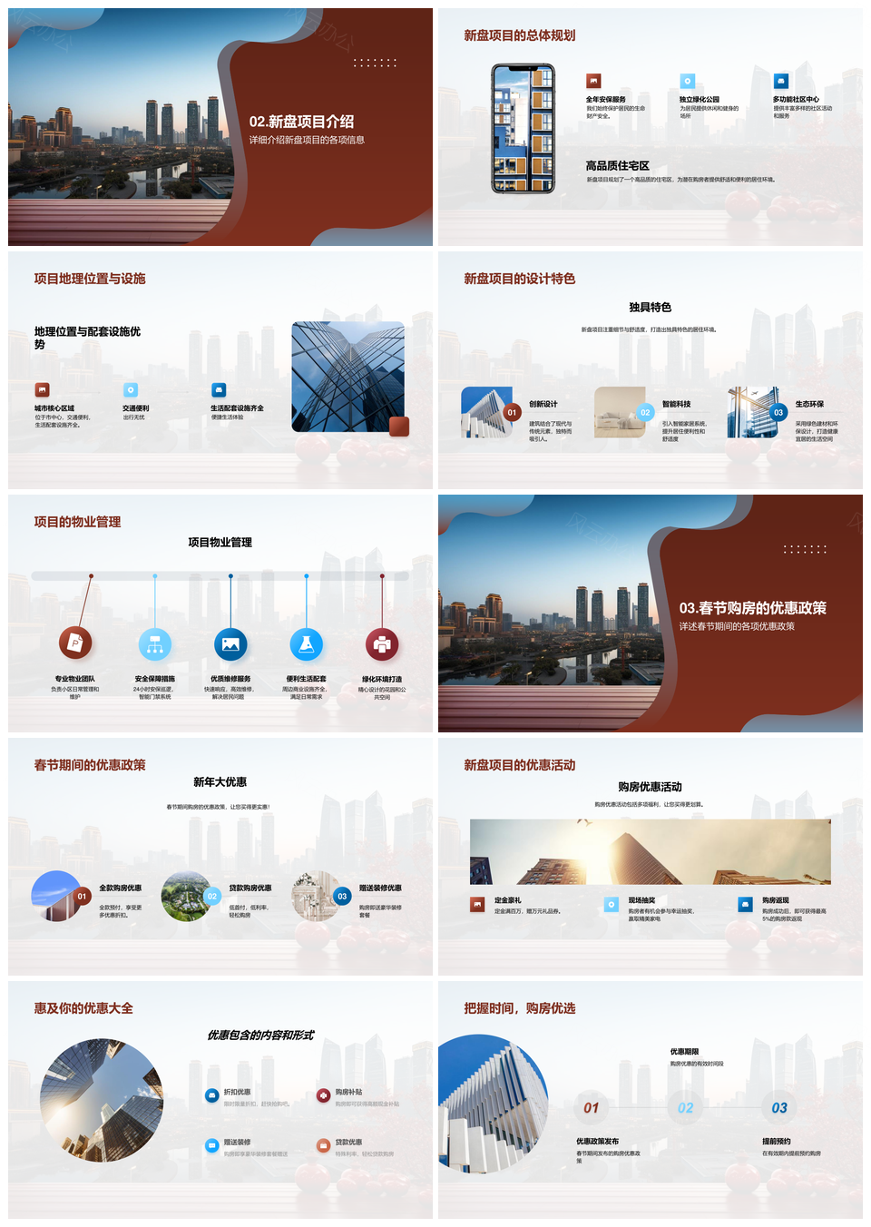 这是一张春节购房新盘优惠盛宴PPT模板,包含春节、购房、新盘、优惠、盛宴等主题内容,也可用作春节购房新盘优惠、购房新盘优惠盛宴、春节购房新盘、购房新盘优惠、新盘优惠盛宴、春节购房优惠、春节新盘优惠、购房优惠盛宴、春节购房盛宴、春节购房、购房新盘、新盘优惠、优惠盛宴、春节新盘、购房优惠等PPT场景使用。 风云办公提供的春节购房新盘优惠盛宴PPT模板,下载格式为pptx,一共28页,作品中文字及图均可以修改和编辑,图片更改请在作品中右键图片并更换,文字修改请直接点击文字进行修改。