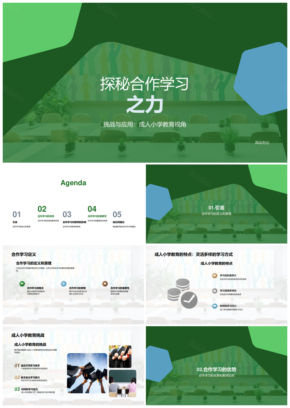 风云办公提供的合作学习提升成人小学教学成效PPT模板,下载格式为pptx,一共23页,作品中文字及图均可以修改和编辑,图片更改请在作品中右键图片并更换,文字修改请直接点击文字进行修改。