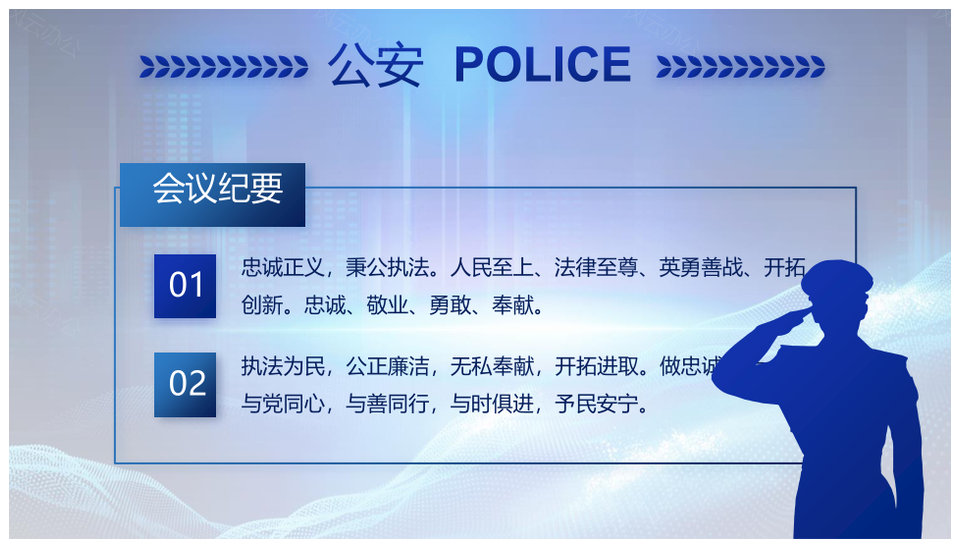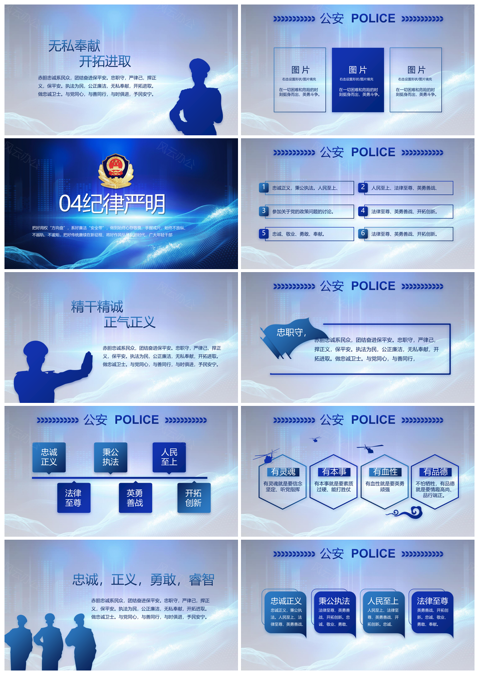 这是一张公安警察年度警务执法警队教育整顿总结PPT模板,包含公安、警察、年度、警务、执法、警队、教育、整顿、总结等主题内容,也可用作年度警务执法警队教育整顿、公安警察警务执法警队教育整顿、警务执法警队教育整顿总结、公安警察年度警务执法警队、年度警队教育整顿总结、公安警察年度教育整顿、警务执法警队教育、公安警察警务执法警队、警队教育整顿总结、年度警务执法警队、年度教育整顿总结、公安警察教育整顿、警务执法警队、警队教育总结、教育整顿总结等PPT场景使用。 风云办公提供的公安警察年度警务执法警队教育整顿总结PPT模板,下载格式为pptx,一共39页,作品中文字及图均可以修改和编辑,图片更改请在作品中右键图片并更换,文字修改请直接点击文字进行修改。