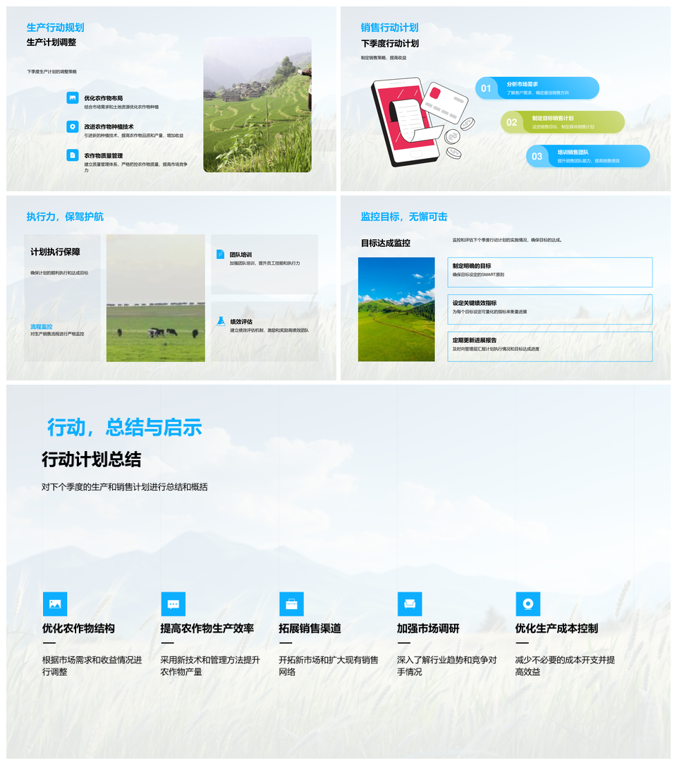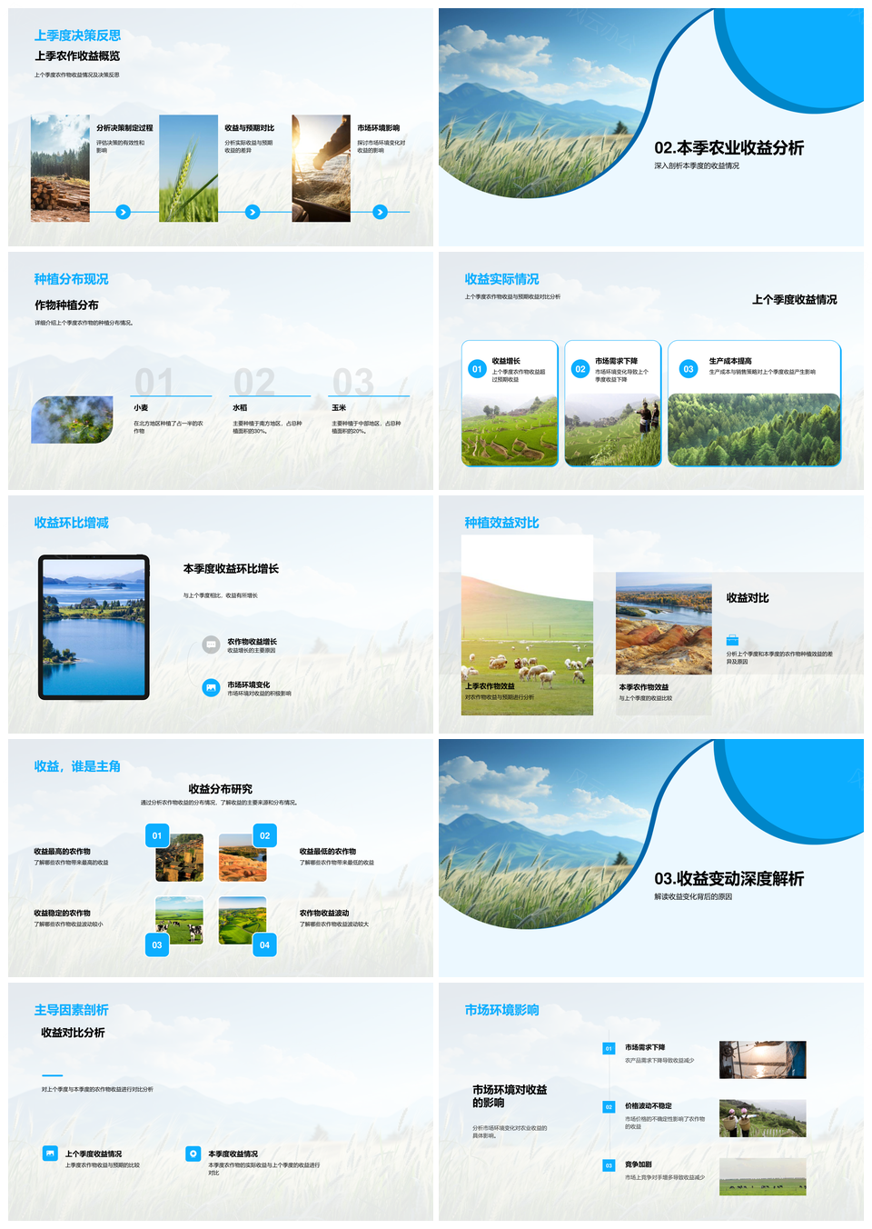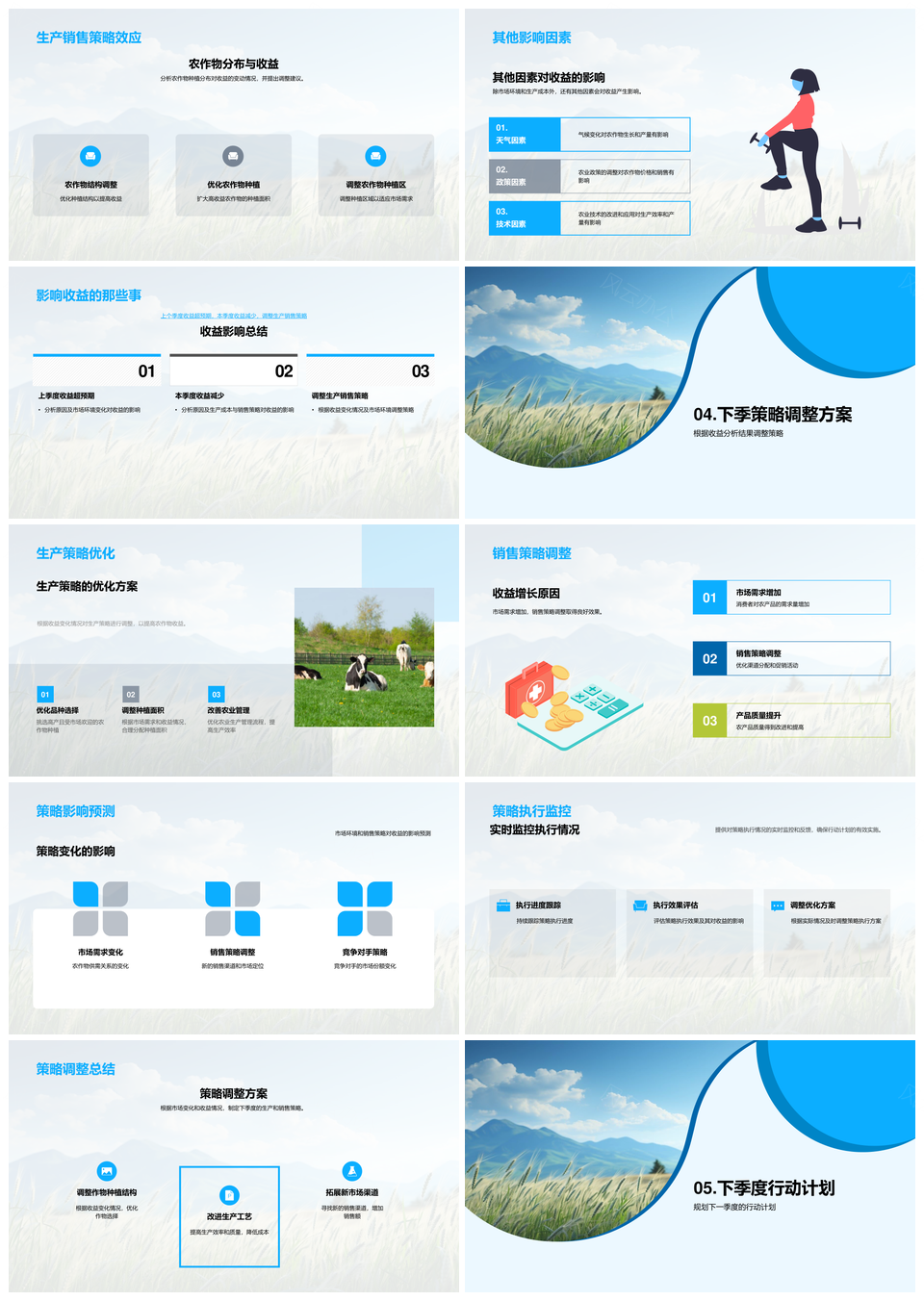 风云办公提供的农业收益季度策略调整与种植分布PPT模板,下载格式为pptx,一共33页,作品中文字及图均可以修改和编辑,图片更改请在作品中右键图片并更换,文字修改请直接点击文字进行修改。