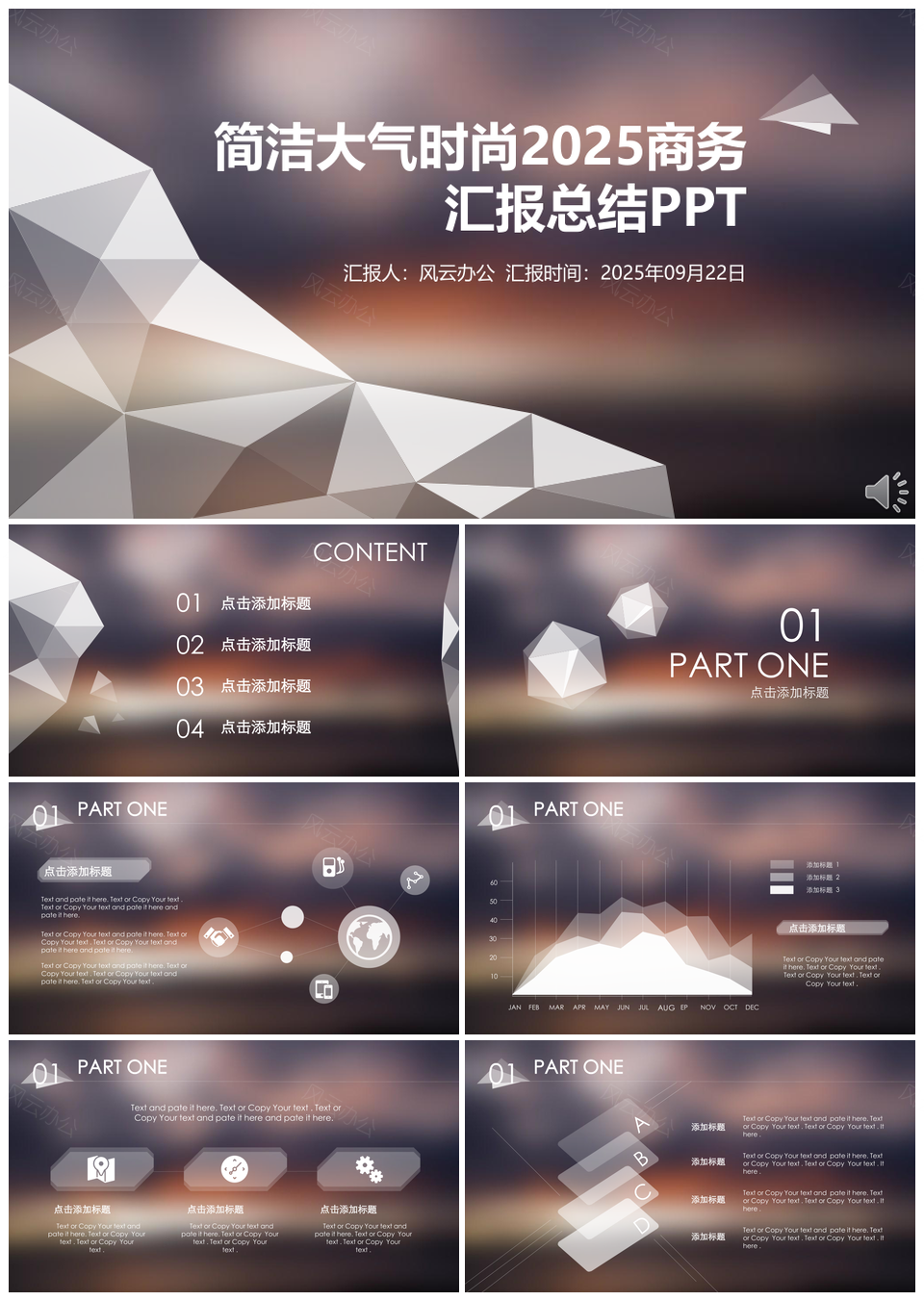 风云办公提供的2025简洁大气时尚商务汇报总结PPT模板,下载格式为pptx,一共30页,作品中文字及图均可以修改和编辑,图片更改请在作品中右键图片并更换,文字修改请直接点击文字进行修改。