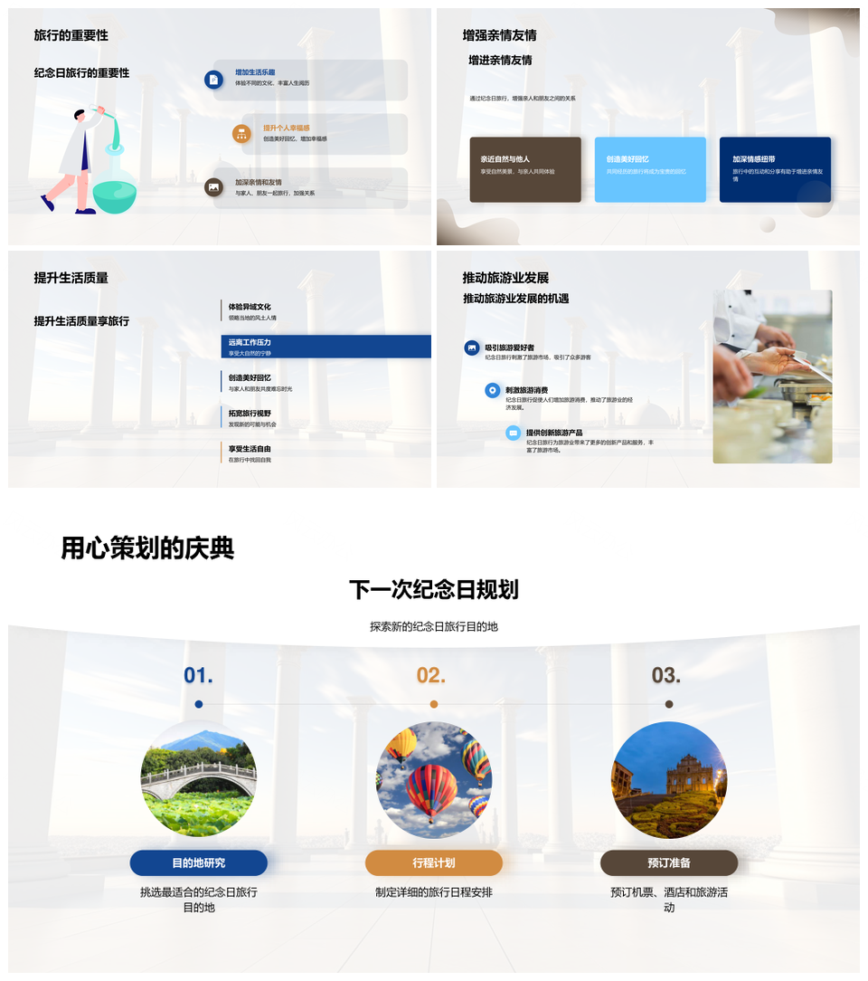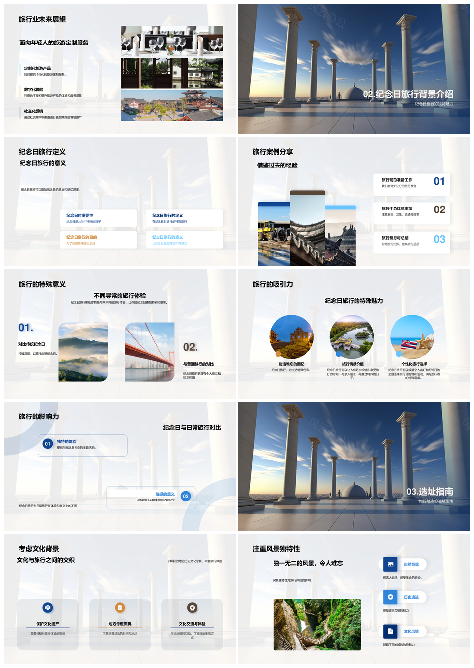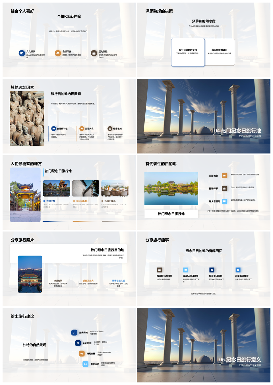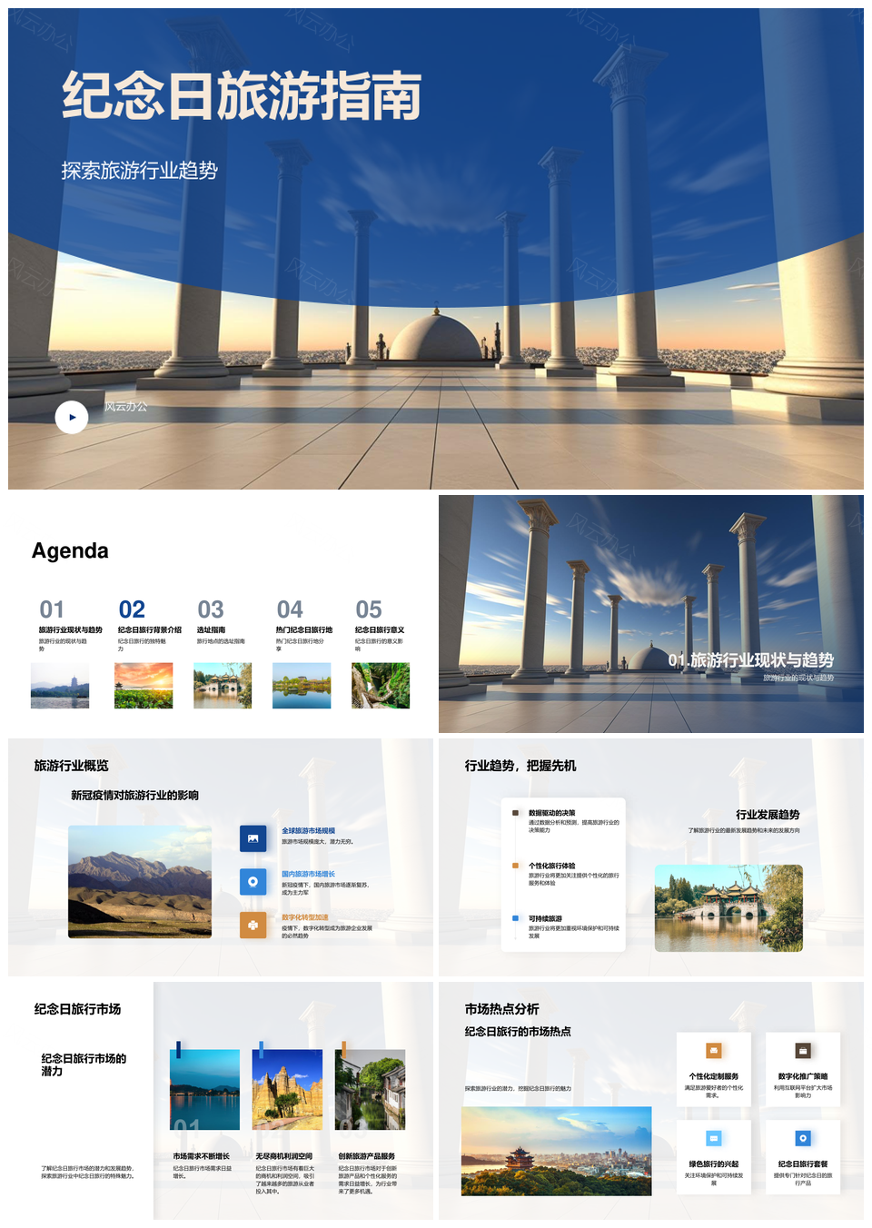 风云办公提供的纪念日旅行趋势历史文化独特风景胜地PPT模板,下载格式为pptx,一共33页,作品中文字及图均可以修改和编辑,图片更改请在作品中右键图片并更换,文字修改请直接点击文字进行修改。