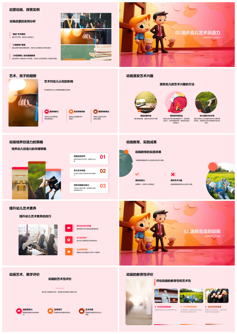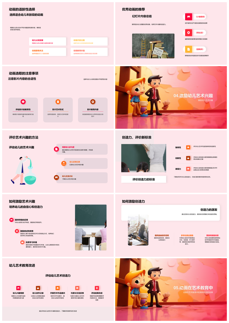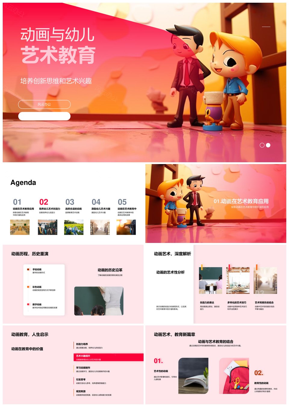 风云办公提供的动画启蒙幼儿艺术兴趣与创新思维培养PPT模板,下载格式为pptx,一共33页,作品中文字及图均可以修改和编辑,图片更改请在作品中右键图片并更换,文字修改请直接点击文字进行修改。