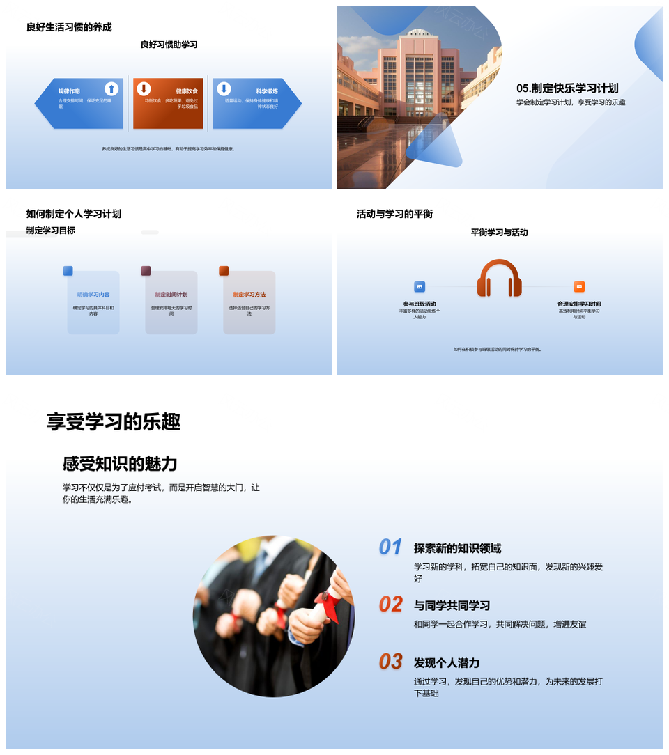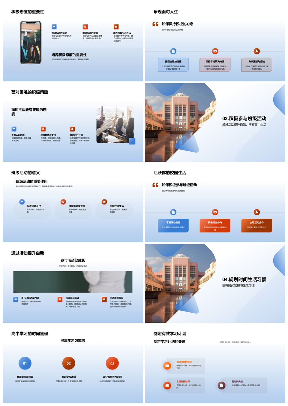 风云办公提供的积极适应高中新挑战规划学习管理时间PPT模板,下载格式为pptx,一共23页,作品中文字及图均可以修改和编辑,图片更改请在作品中右键图片并更换,文字修改请直接点击文字进行修改。
