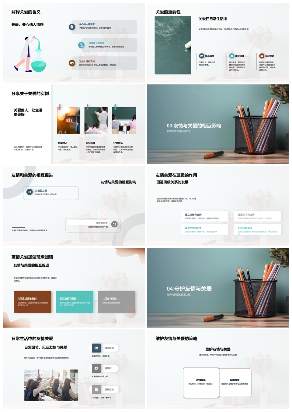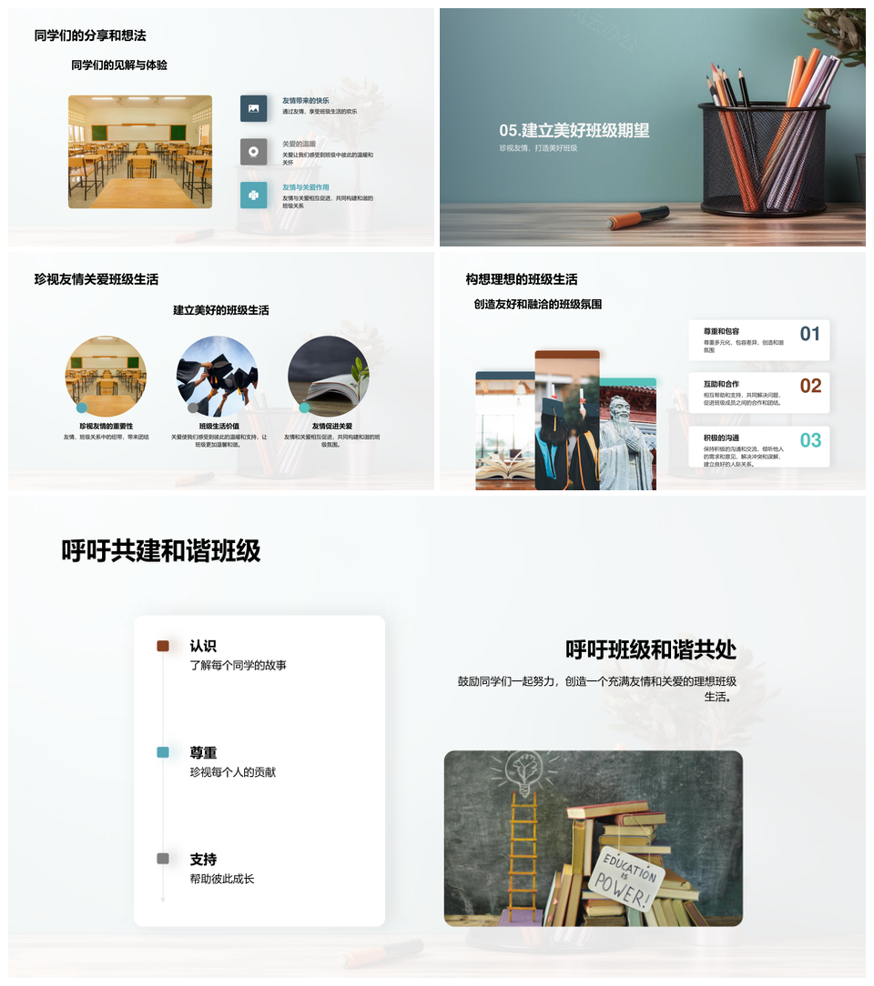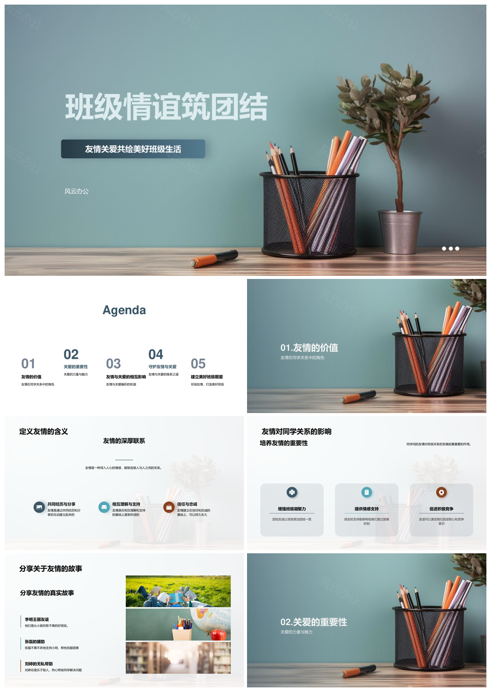 风云办公提供的同窗情谊共筑团结守护班级点滴PPT模板,下载格式为pptx,一共23页,作品中文字及图均可以修改和编辑,图片更改请在作品中右键图片并更换,文字修改请直接点击文字进行修改。