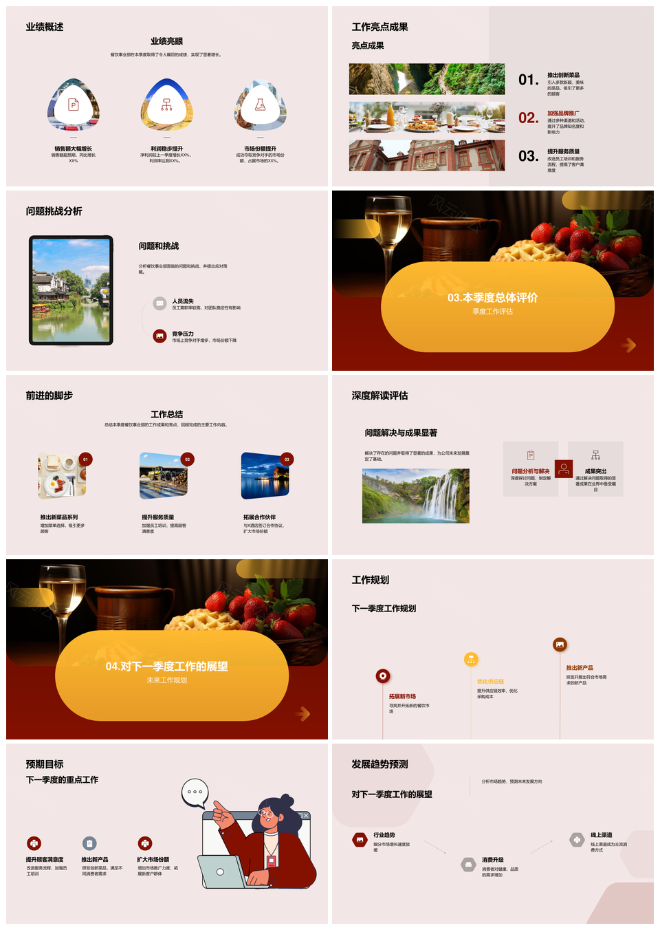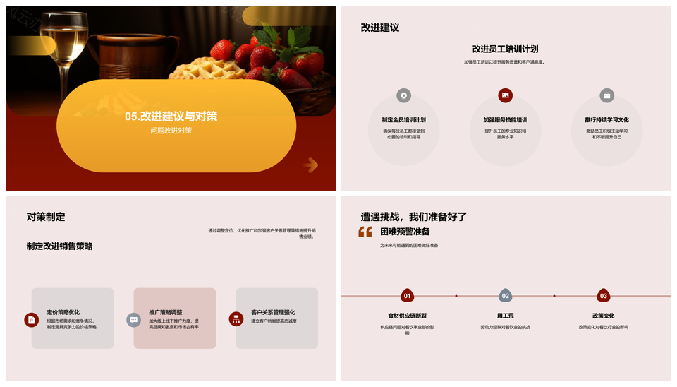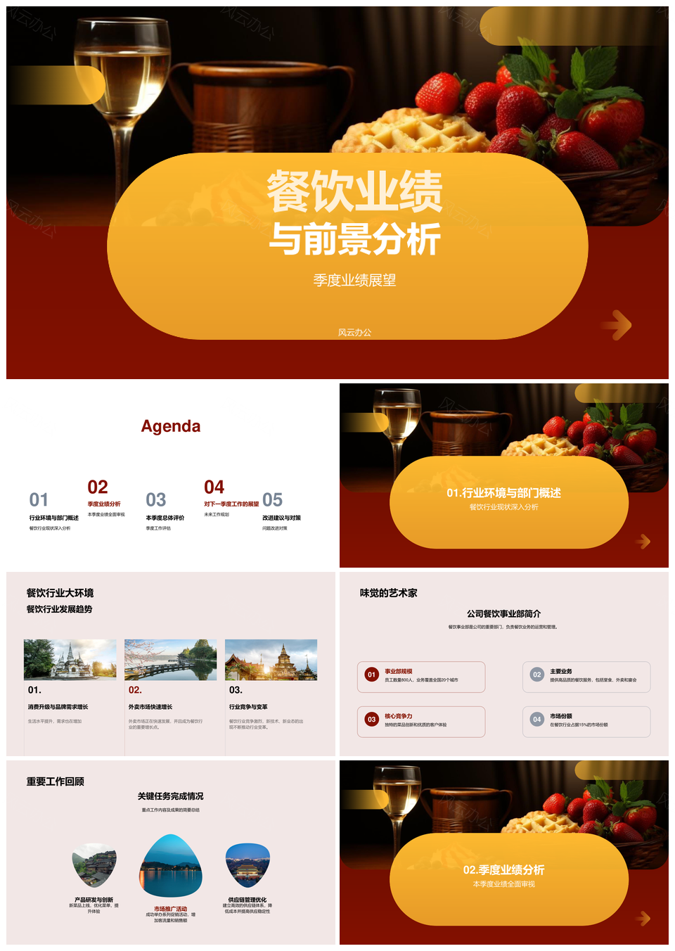 风云办公提供的餐饮业绩前景季度分析对策建议PPT模板,下载格式为pptx,一共22页,作品中文字及图均可以修改和编辑,图片更改请在作品中右键图片并更换,文字修改请直接点击文字进行修改。