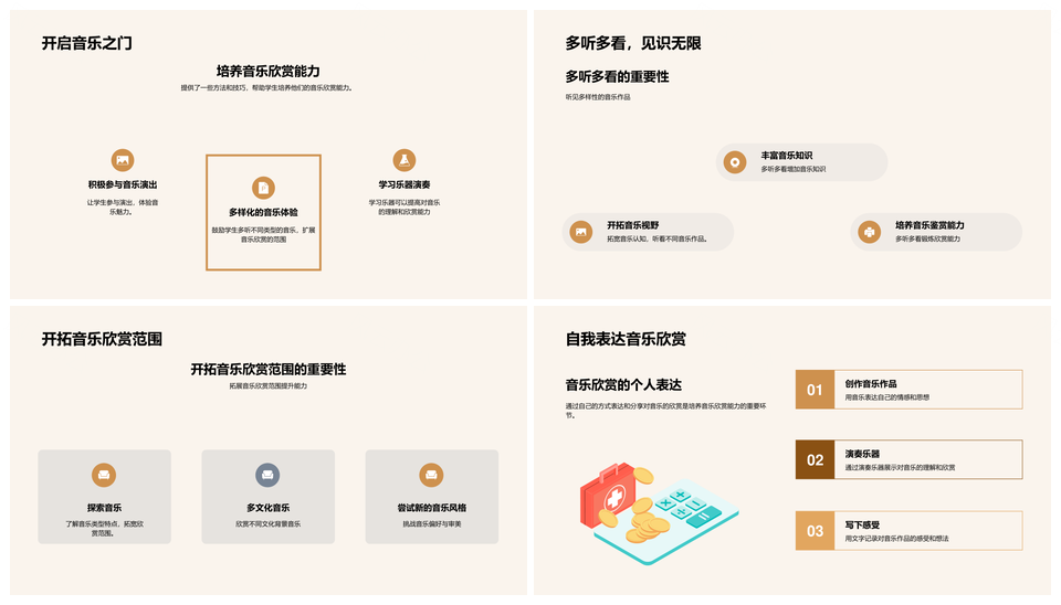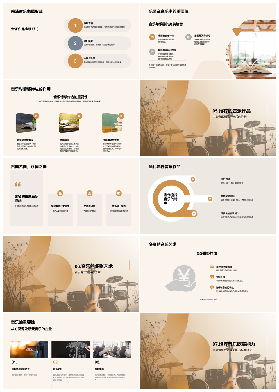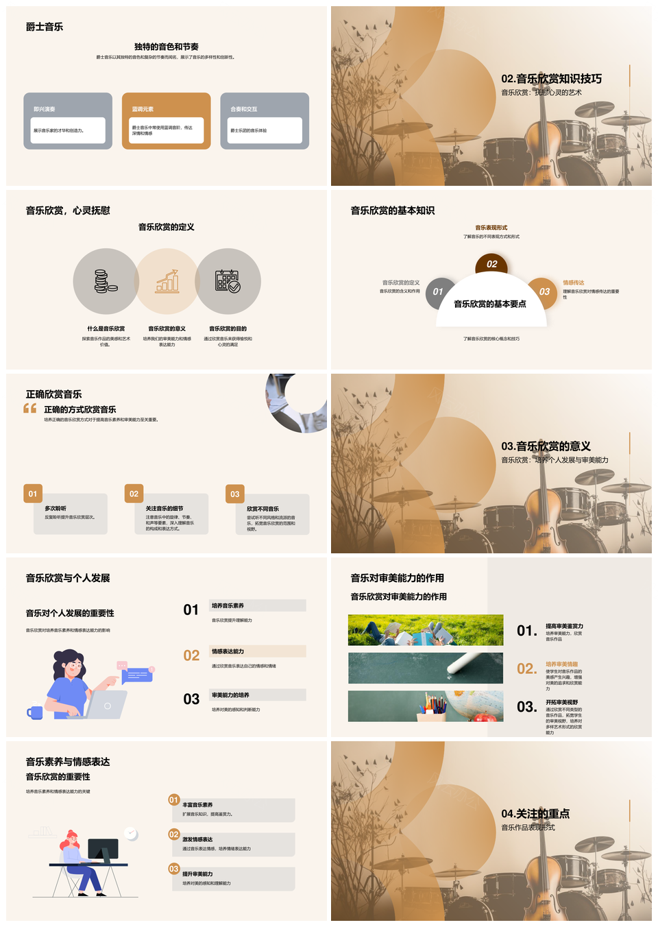这是一张音乐课古典流行摇滚乡村爵士与乐器欣赏PPT模板,包含音乐课、古典、流行、摇滚、乡村、爵士、乐器、欣赏等主题内容,也可用作音乐课古典流行摇滚乡村、音乐课古典流行摇滚、古典流行摇滚乡村、流行摇滚乡村爵士、摇滚乡村爵士乐器、乡村爵士乐器欣赏、古典流行摇滚、流行摇滚乡村、摇滚乡村爵士、乡村爵士乐器、爵士乐器欣赏、音乐课乐器欣赏、古典流行、流行摇滚、乐器欣赏等PPT场景使用。 风云办公提供的音乐课古典流行摇滚乡村爵士与乐器欣赏PPT模板,下载格式为pptx,一共32页,作品中文字及图均可以修改和编辑,图片更改请在作品中右键图片并更换,文字修改请直接点击文字进行修改。