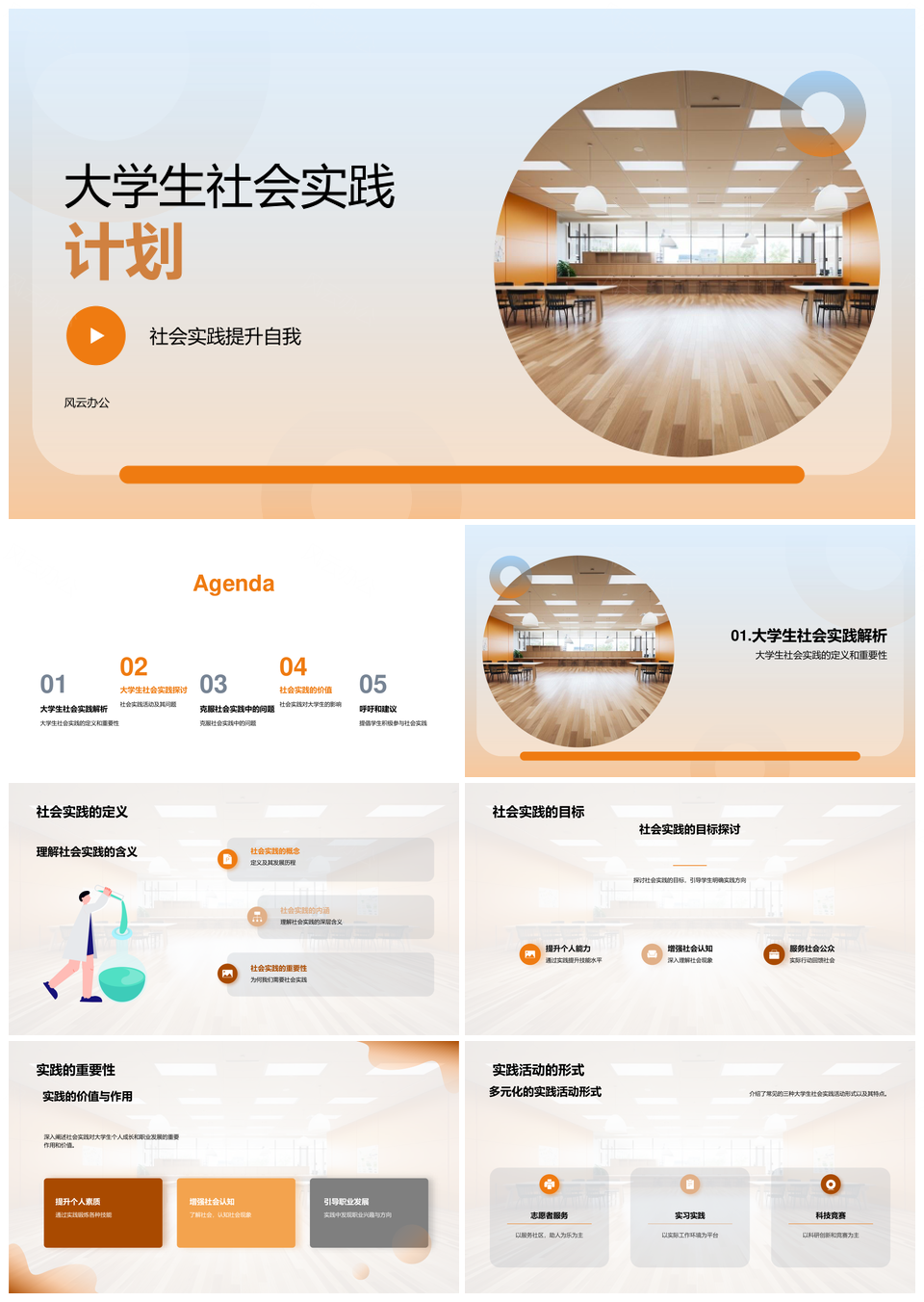 风云办公提供的大学生社会实践提升理论实践技能PPT模板,下载格式为pptx,一共33页,作品中文字及图均可以修改和编辑,图片更改请在作品中右键图片并更换,文字修改请直接点击文字进行修改。