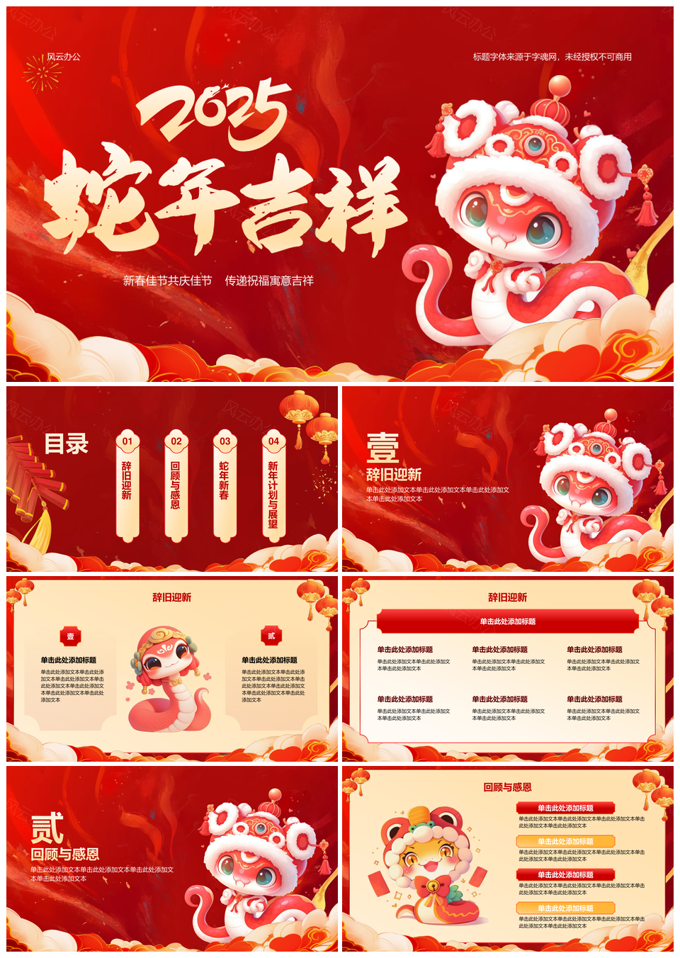 风云办公提供的2025蛇年大吉新春喜庆吉祥通用PPT模板,下载格式为pptx,一共18页,作品中文字及图均可以修改和编辑,图片更改请在作品中右键图片并更换,文字修改请直接点击文字进行修改。