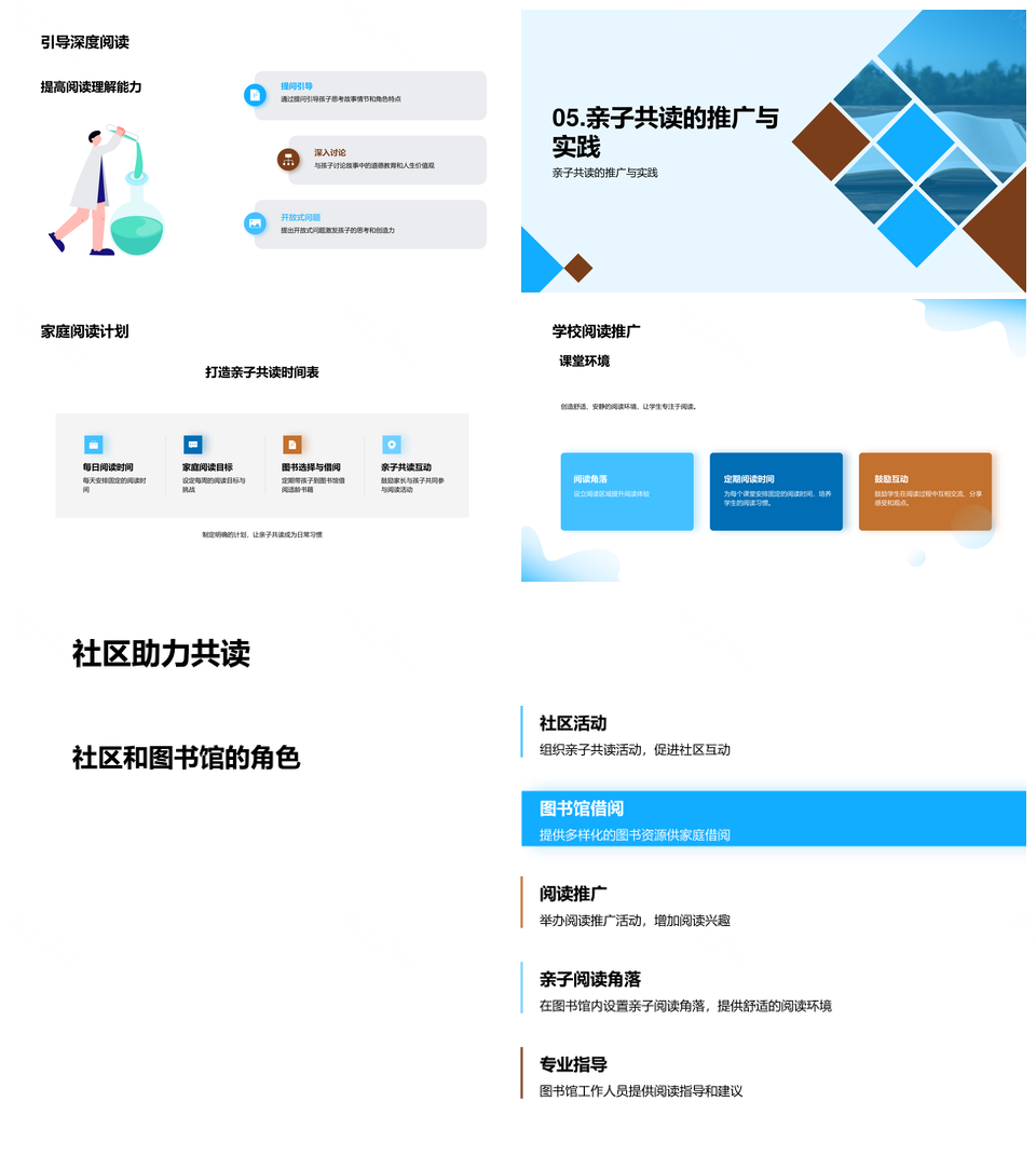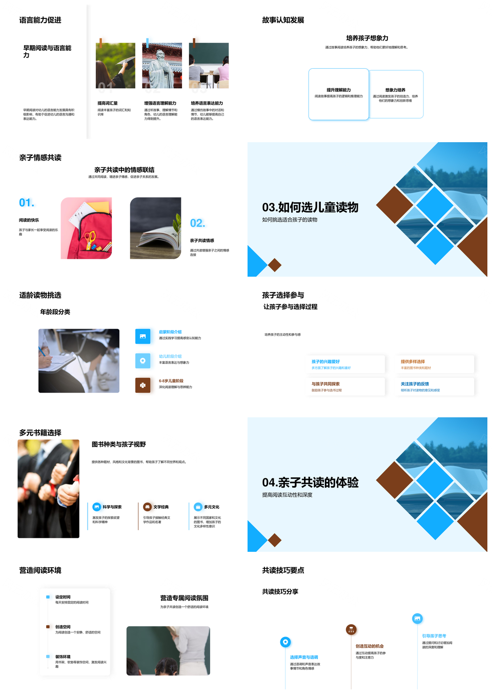 这是一张亲子共读启智开卷伴成长PPT模板,包含亲子、共读、启智、开卷、伴成长等主题内容,也可用作亲子共读启智开卷、共读启智开卷成长、亲子共读启智、亲子共读开卷、亲子共读成长、共读启智开卷、共读启智成长、共读开卷成长、启智开卷成长、亲子共读、亲子启智、亲子成长、共读启智、共读开卷、开卷成长等PPT场景使用。 风云办公提供的亲子共读启智开卷伴成长PPT模板,下载格式为pptx,一共23页,作品中文字及图均可以修改和编辑,图片更改请在作品中右键图片并更换,文字修改请直接点击文字进行修改。
