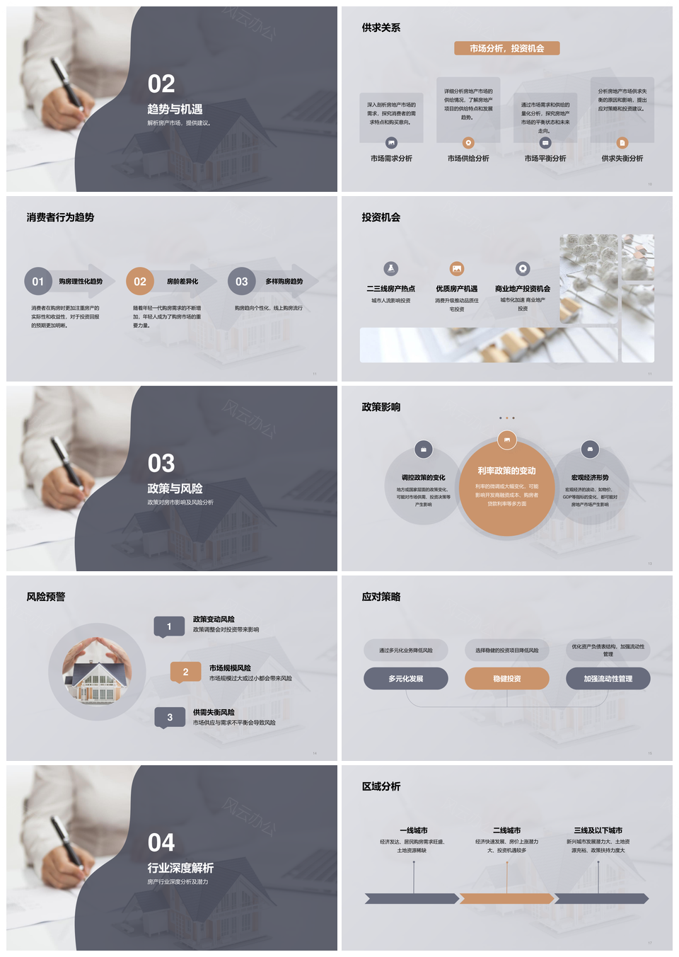 风云办公提供的黄灰现代商务房地产金融营销趋势分析PPT模板,下载格式为pptx,一共24页,作品中文字及图均可以修改和编辑,图片更改请在作品中右键图片并更换,文字修改请直接点击文字进行修改。