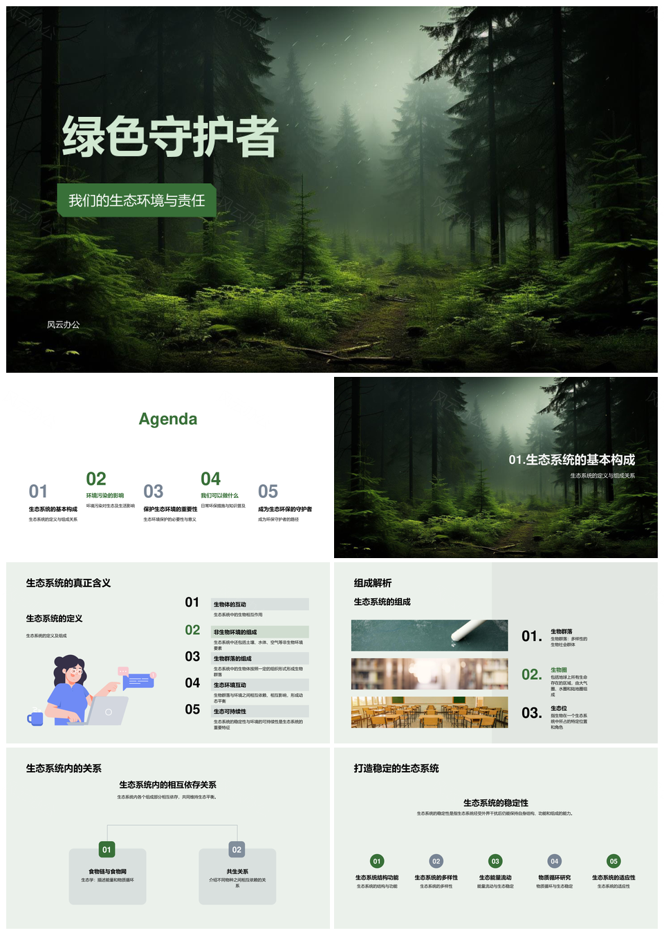风云办公提供的绿色守护者育环保护生态共建森林PPT模板,下载格式为pptx,一共28页,作品中文字及图均可以修改和编辑,图片更改请在作品中右键图片并更换,文字修改请直接点击文字进行修改。