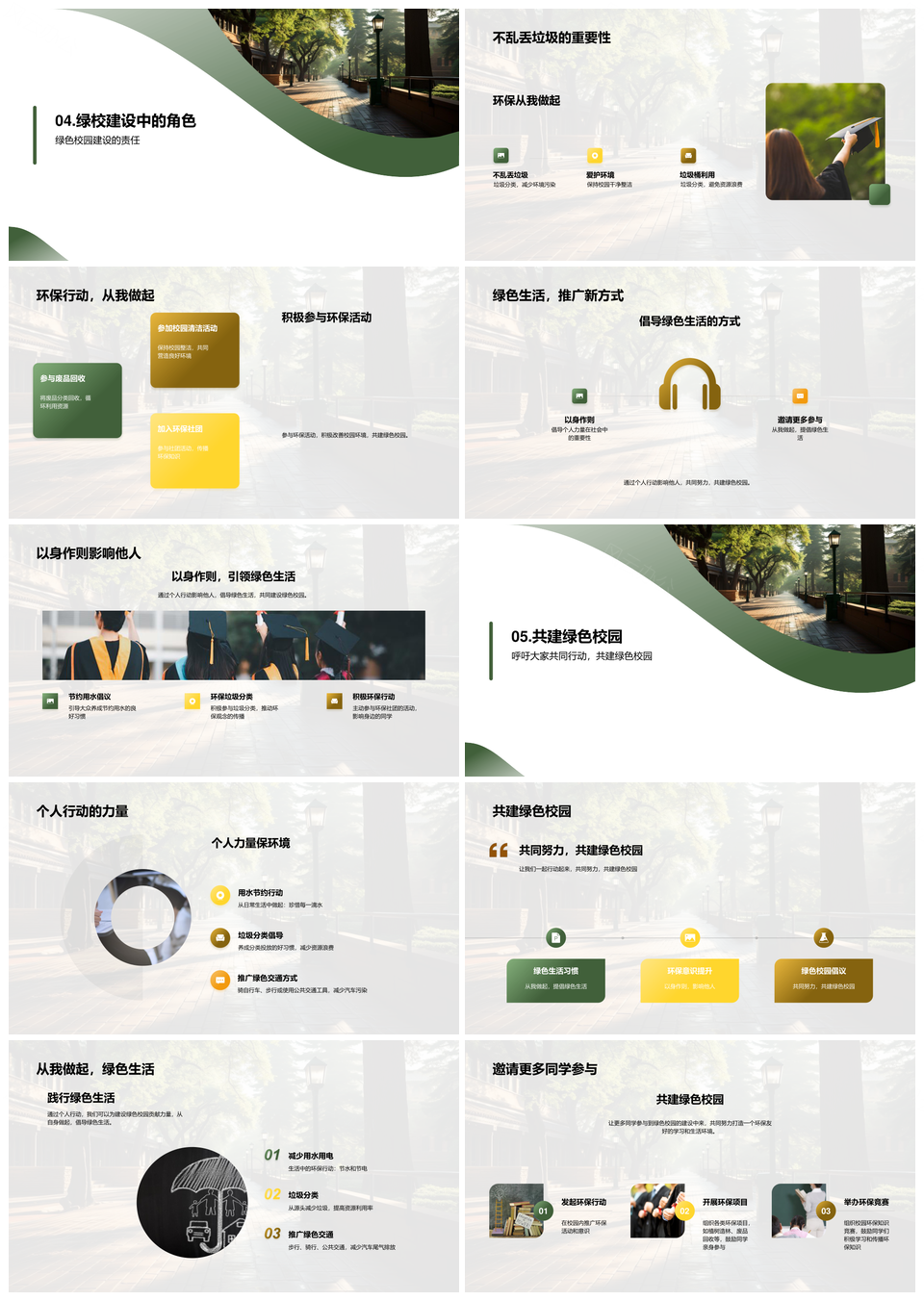 这是一张绿色校园环保教育引领学生共建绿色生活PPT模板,包含绿色校园、环保教育、引领、学生、共建、绿色生活等主题内容,也可用作绿色校园环保教育引领学生、绿色校园环保教育、环保教育引领学生、教育引领学生共建、引领学生共建绿色生活、校园环保教育引领、环保教育引领学生共建、引领学生共建绿色、学生共建绿色生活、绿色校园环保、校园环保教育、环保教育引领、教育引领学生、引领学生共建、学生共建绿色等PPT场景使用。 风云办公提供的绿色校园环保教育引领学生共建绿色生活PPT模板,下载格式为pptx,一共28页,作品中文字及图均可以修改和编辑,图片更改请在作品中右键图片并更换,文字修改请直接点击文字进行修改。