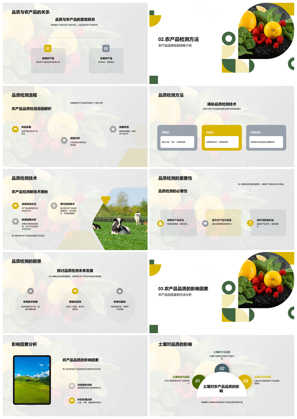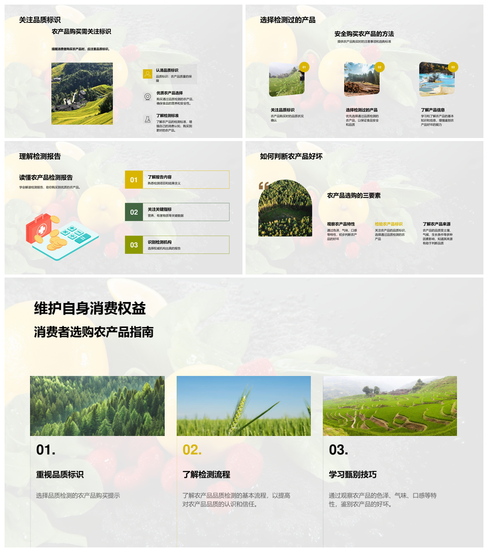 这是一张农产品品质鉴别检测技术分类安全购买指南PPT模板,包含农产品、品质、鉴别、检测、技术、分类、安全、购买、指南等主题内容,也可用作农产品品质鉴别检测、品质鉴别检测技术、鉴别检测技术分类、检测技术分类安全、技术分类安全购买指南、农产品品质鉴别、品质鉴别检测、鉴别检测技术、检测技术分类、技术分类安全、分类安全购买指南、农产品检测技术、检测技术安全、技术安全购买指南、安全购买指南检测等PPT场景使用。 风云办公提供的农产品品质鉴别检测技术分类安全购买指南PPT模板,下载格式为pptx,一共33页,作品中文字及图均可以修改和编辑,图片更改请在作品中右键图片并更换,文字修改请直接点击文字进行修改。