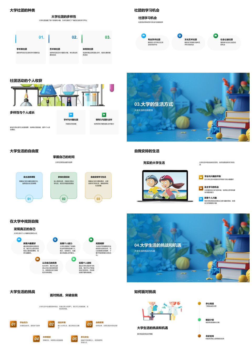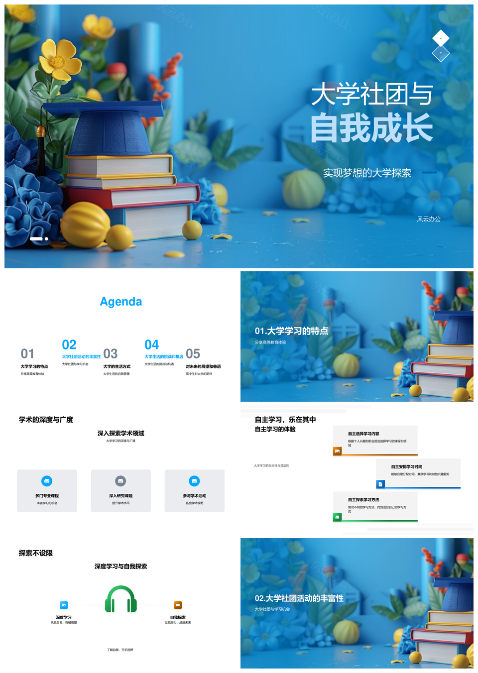 风云办公提供的大学社团活动与深度学习成长探索PPT模板,下载格式为pptx,一共23页,作品中文字及图均可以修改和编辑,图片更改请在作品中右键图片并更换,文字修改请直接点击文字进行修改。