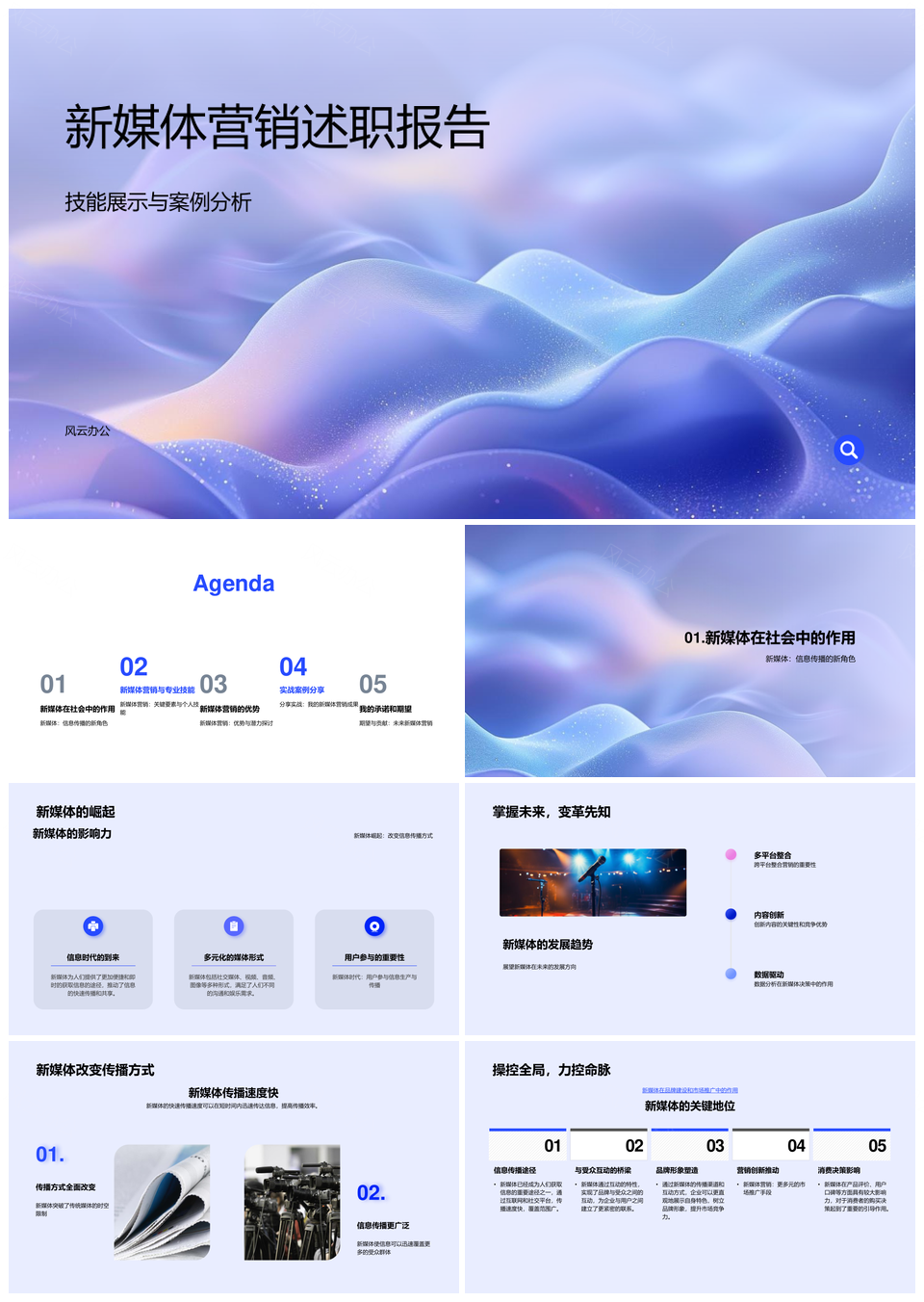 风云办公提供的新媒体营销专业技能案例与发展分析PPT模板,下载格式为pptx,一共28页,作品中文字及图均可以修改和编辑,图片更改请在作品中右键图片并更换,文字修改请直接点击文字进行修改。