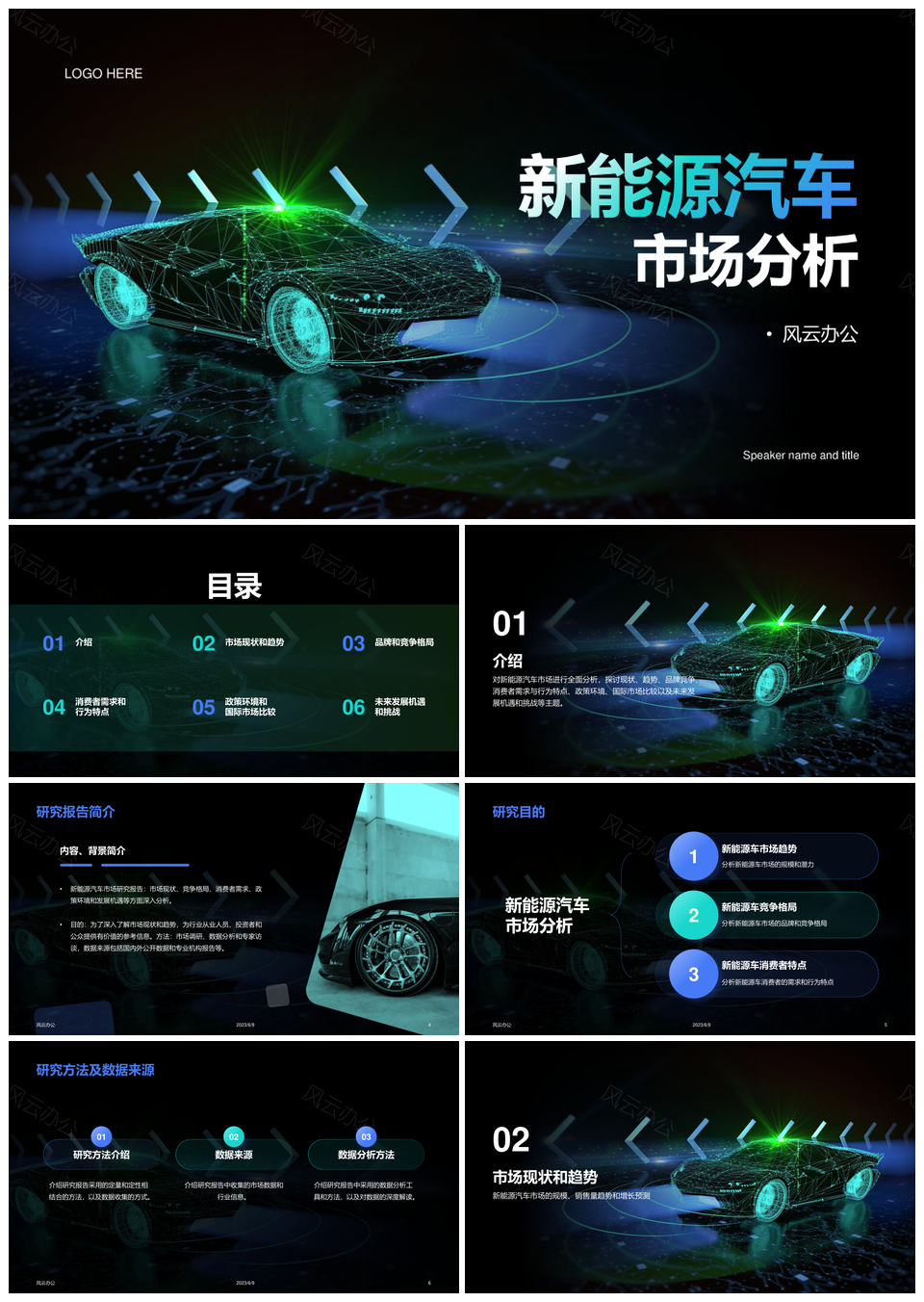 黑蓝创意酷炫新能源车市分析研究报告CTRPPT模板推荐