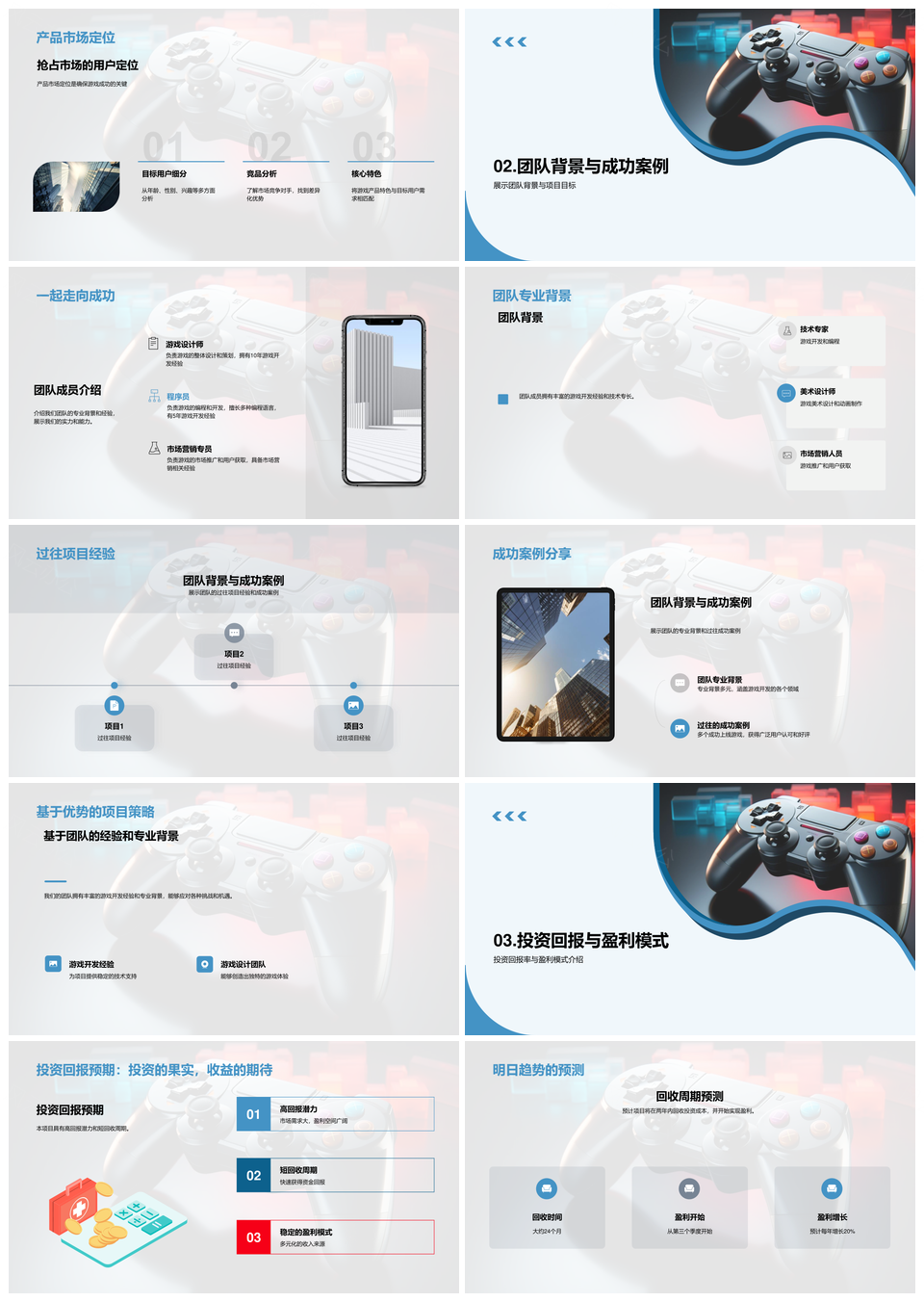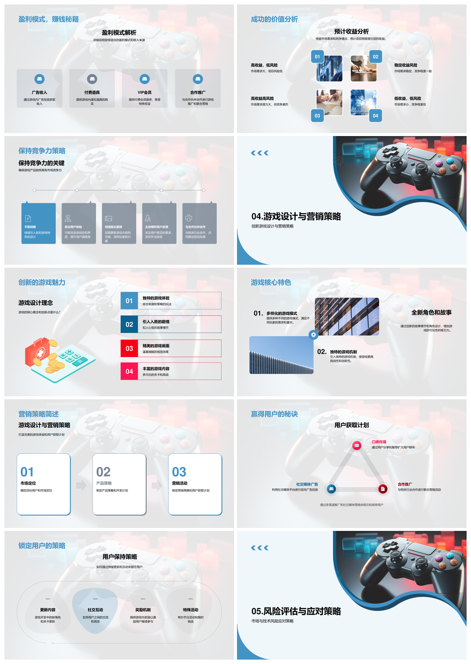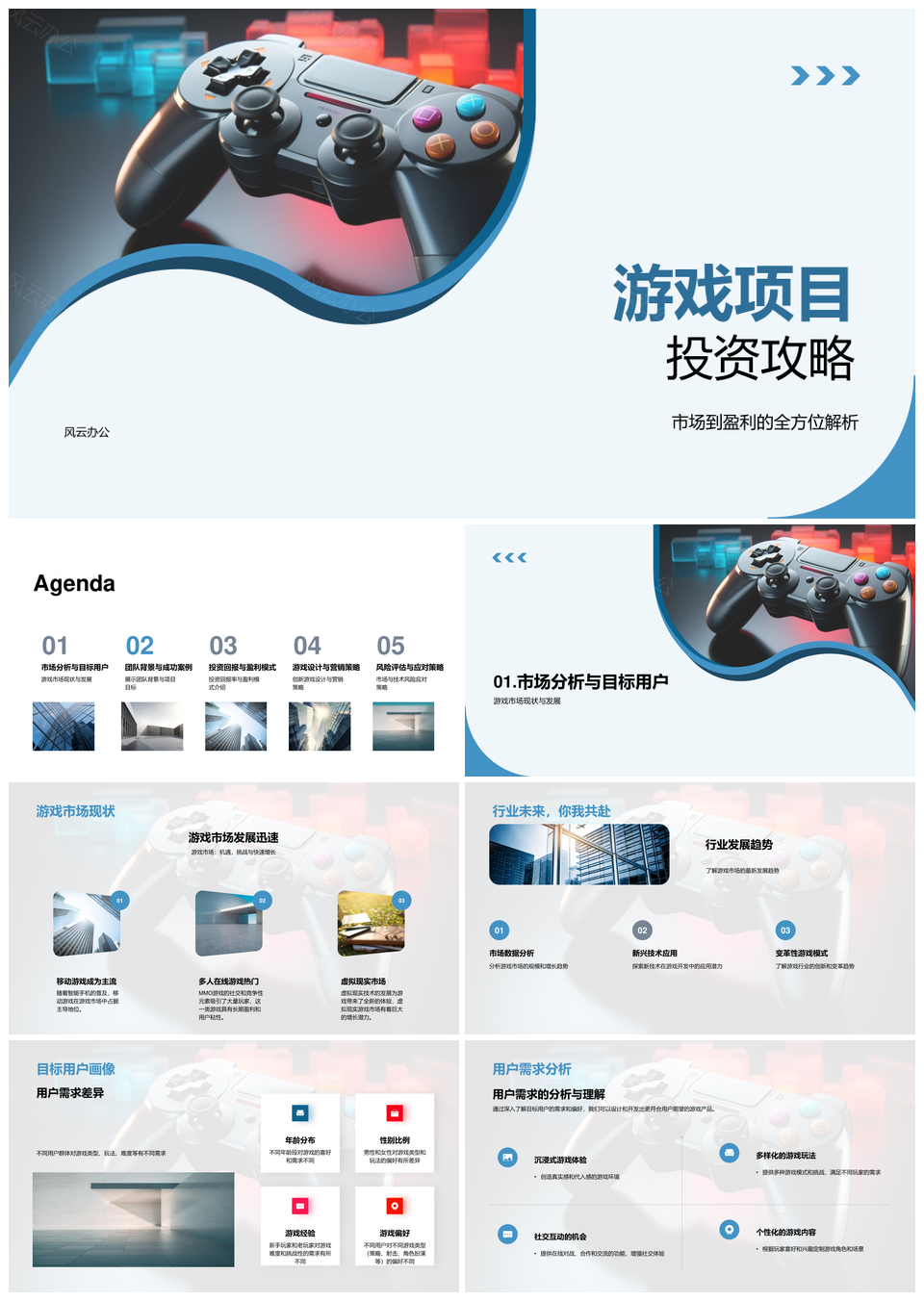 这是一张游戏项目投资攻略市场分析团队创新回报PPT模板,包含游戏项目、投资攻略、市场、分析团队、创新、回报等主题内容,也可用作游戏项目投资攻略、投资攻略市场分析、市场分析团队创新、分析团队创新回报、游戏项目投资、项目投资攻略、投资攻略市场、攻略市场分析、市场分析团队、分析团队创新、团队创新回报、游戏项目、项目投资、投资攻略、市场分析等PPT场景使用。 风云办公提供的游戏项目投资攻略市场分析团队创新回报PPT模板,下载格式为pptx,一共33页,作品中文字及图均可以修改和编辑,图片更改请在作品中右键图片并更换,文字修改请直接点击文字进行修改。