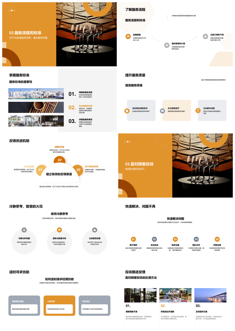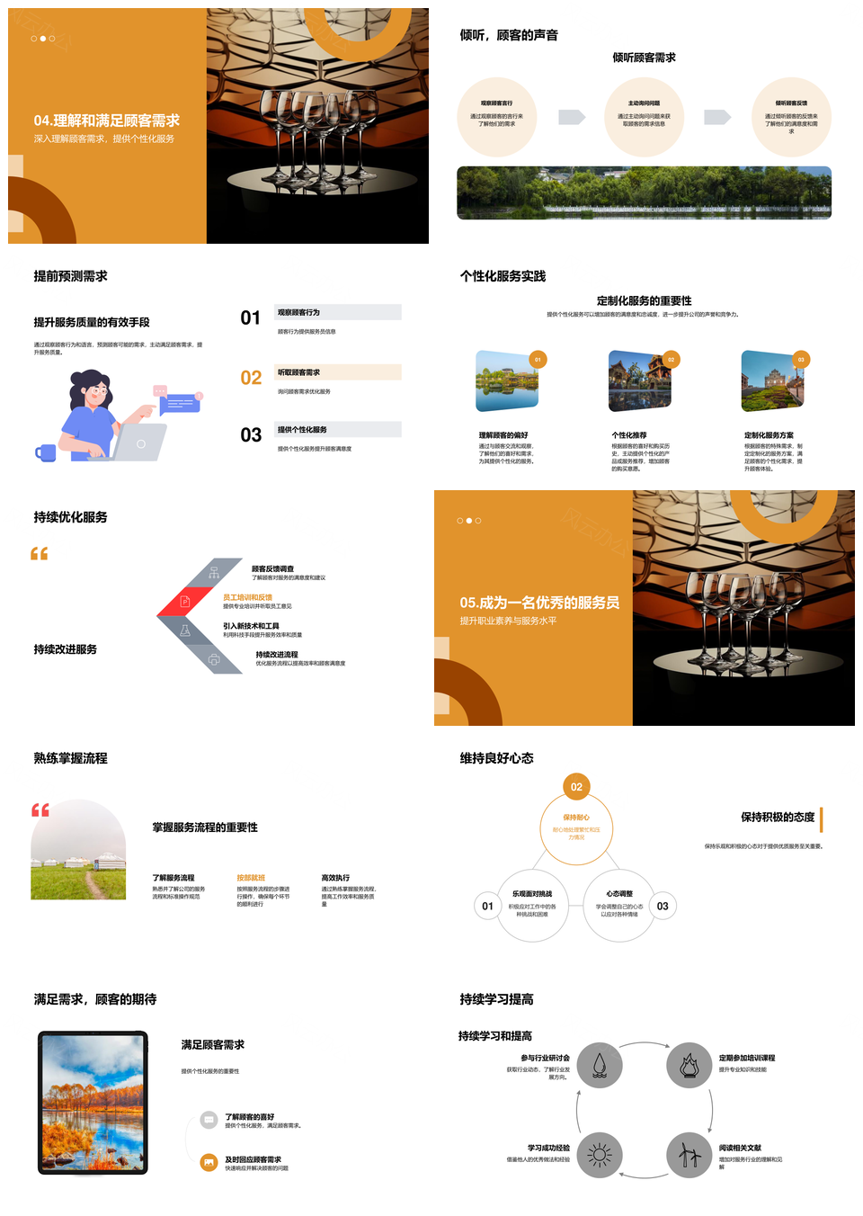 这是一张服务员成长服务技巧流程与顾客需求提升PPT模板,包含服务员、成长、服务技巧、流程、顾客需求、提升等主题内容,也可用作服务员成长服务技巧、服务技巧流程顾客、流程顾客需求提升、服务员服务技巧、流程顾客需求、顾客需求提升、服务技巧流程、成长服务技巧、服务员成长、服务技巧、顾客需求、流程提升、需求提升、技巧流程、流程顾客等PPT场景使用。 风云办公提供的服务员成长服务技巧流程与顾客需求提升PPT模板,下载格式为pptx,一共28页,作品中文字及图均可以修改和编辑,图片更改请在作品中右键图片并更换,文字修改请直接点击文字进行修改。