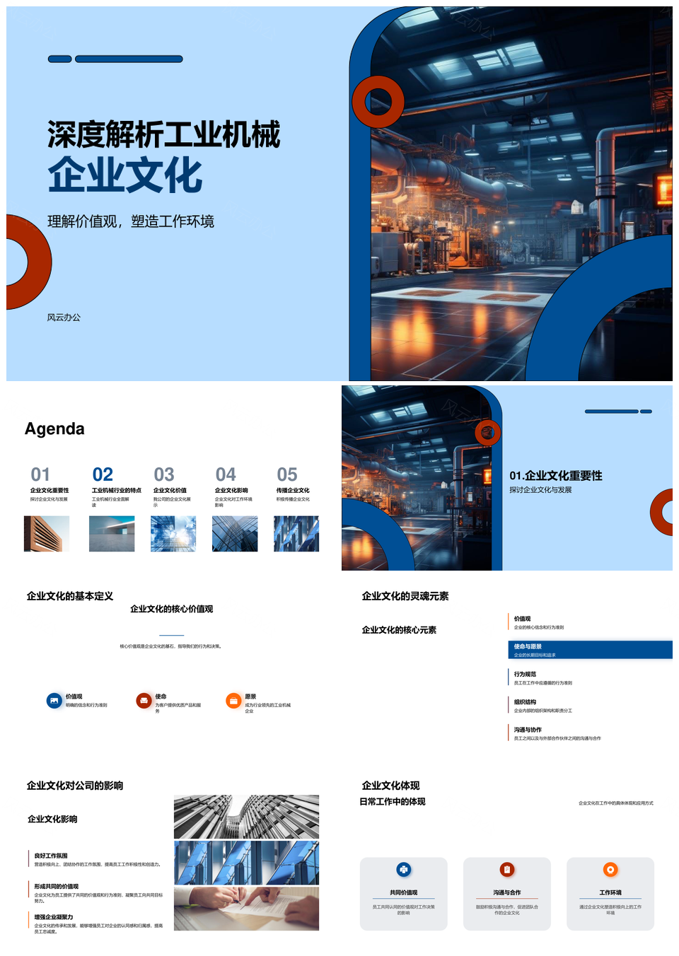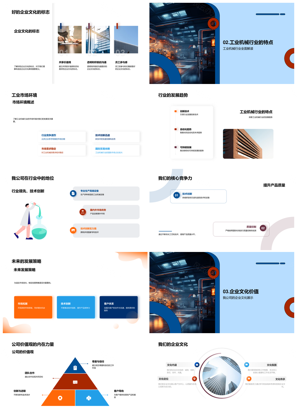 风云办公提供的工业机械企业文化构建与市场发展趋势PPT模板,下载格式为pptx,一共33页,作品中文字及图均可以修改和编辑,图片更改请在作品中右键图片并更换,文字修改请直接点击文字进行修改。
