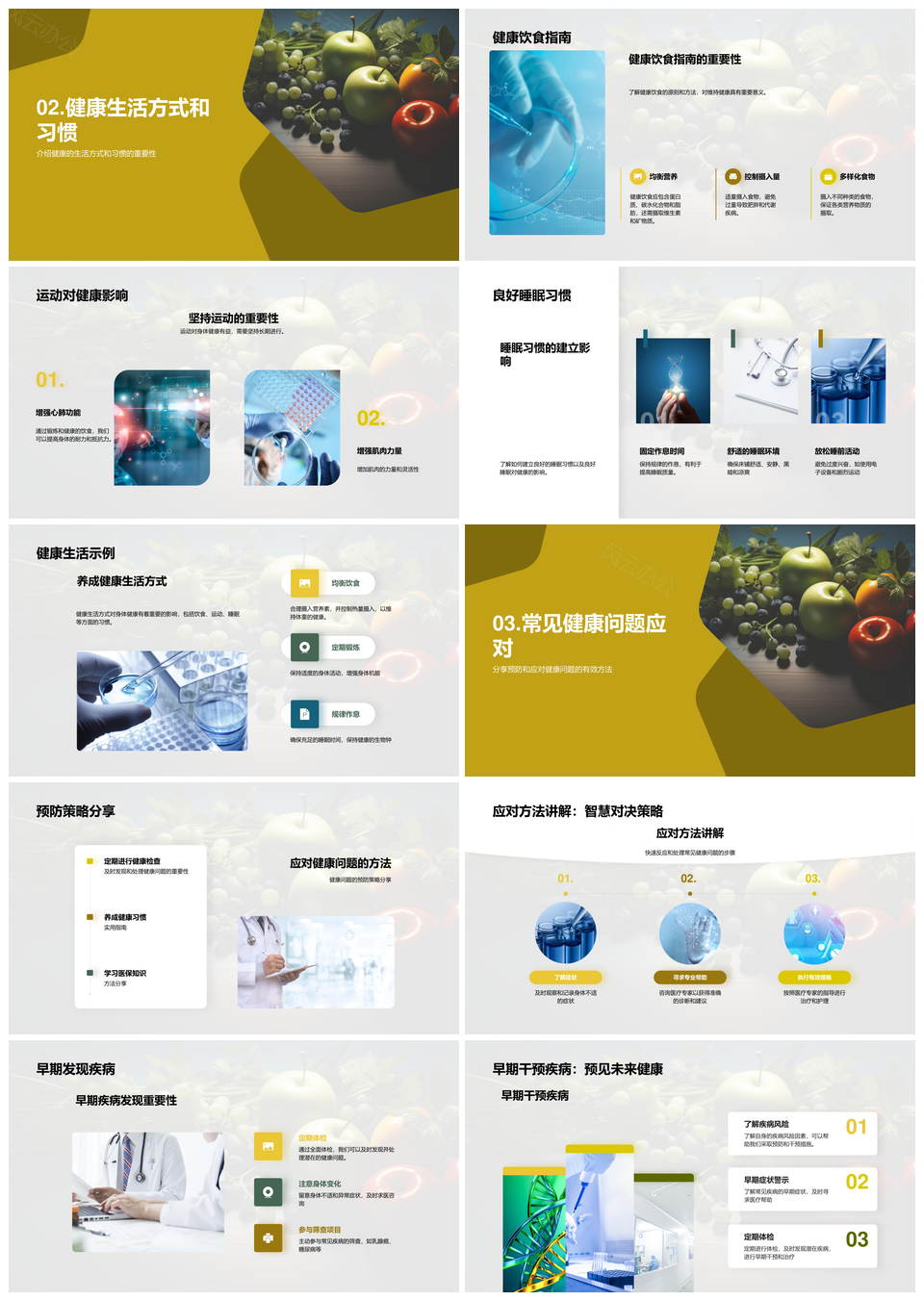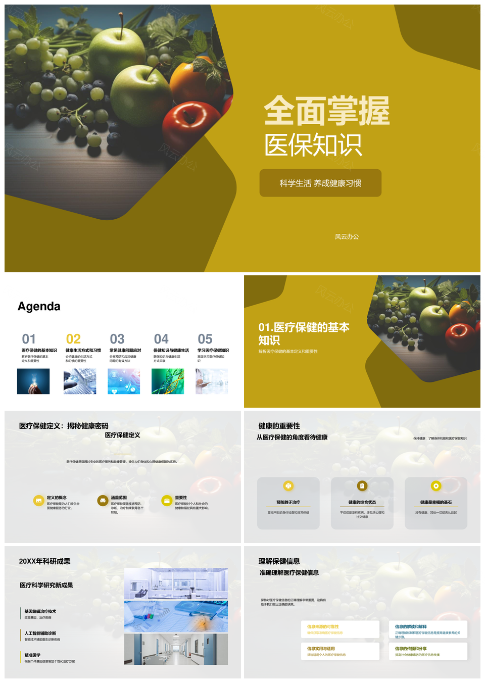 风云办公提供的医保健康科学生活疾病预防保健指南PPT模板,下载格式为pptx,一共28页,作品中文字及图均可以修改和编辑,图片更改请在作品中右键图片并更换,文字修改请直接点击文字进行修改。