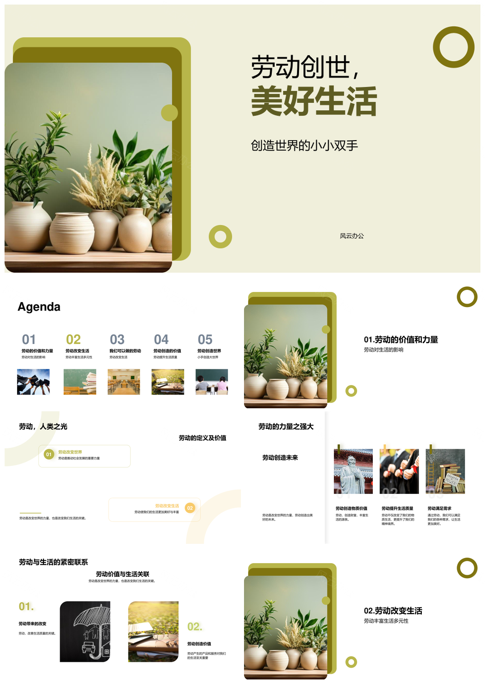 风云办公提供的劳动创世手作绿植家务创造美好生活PPT模板,下载格式为pptx,一共23页,作品中文字及图均可以修改和编辑,图片更改请在作品中右键图片并更换,文字修改请直接点击文字进行修改。