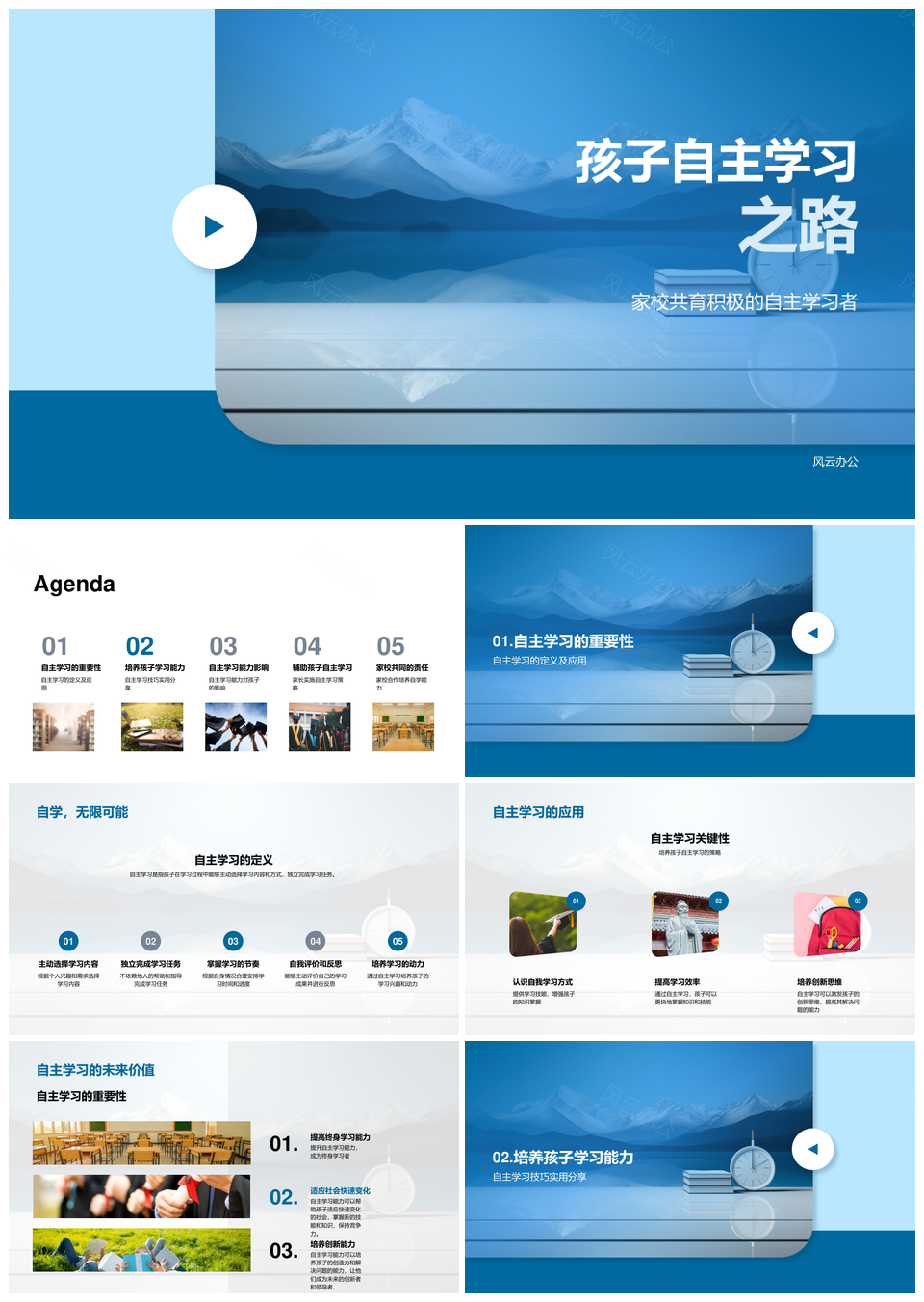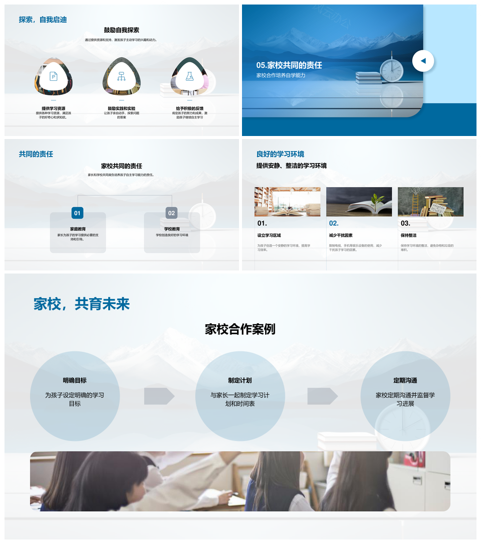 风云办公提供的家校共育启孩子自主学习探索PPT模板,下载格式为pptx,一共23页,作品中文字及图均可以修改和编辑,图片更改请在作品中右键图片并更换,文字修改请直接点击文字进行修改。