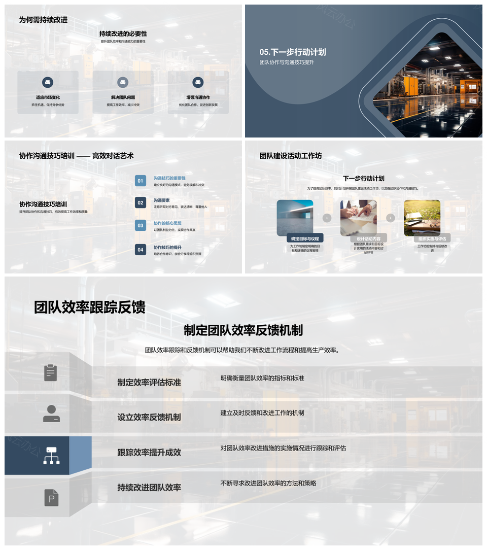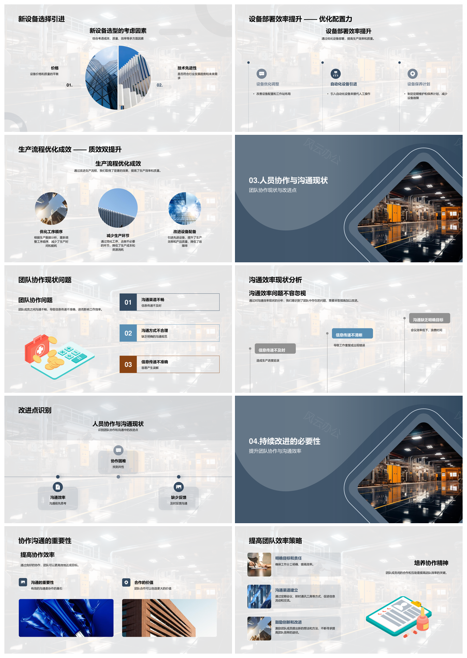 风云办公提供的团队协作持续改进机械生产提质增效PPT模板,下载格式为pptx,一共23页,作品中文字及图均可以修改和编辑,图片更改请在作品中右键图片并更换,文字修改请直接点击文字进行修改。