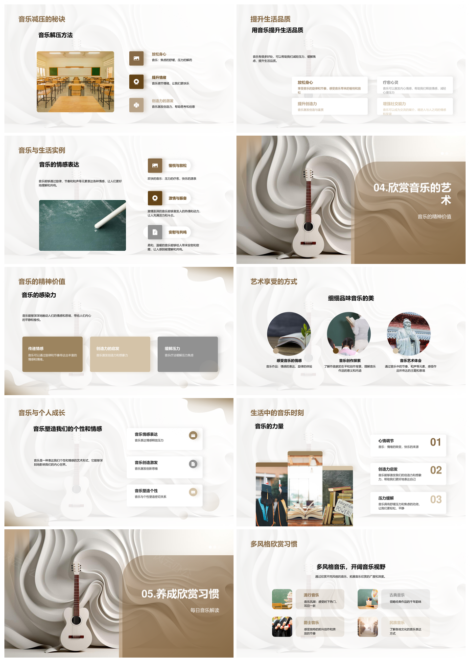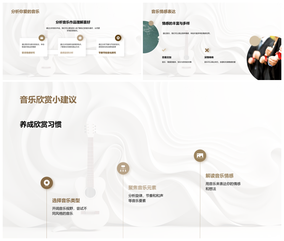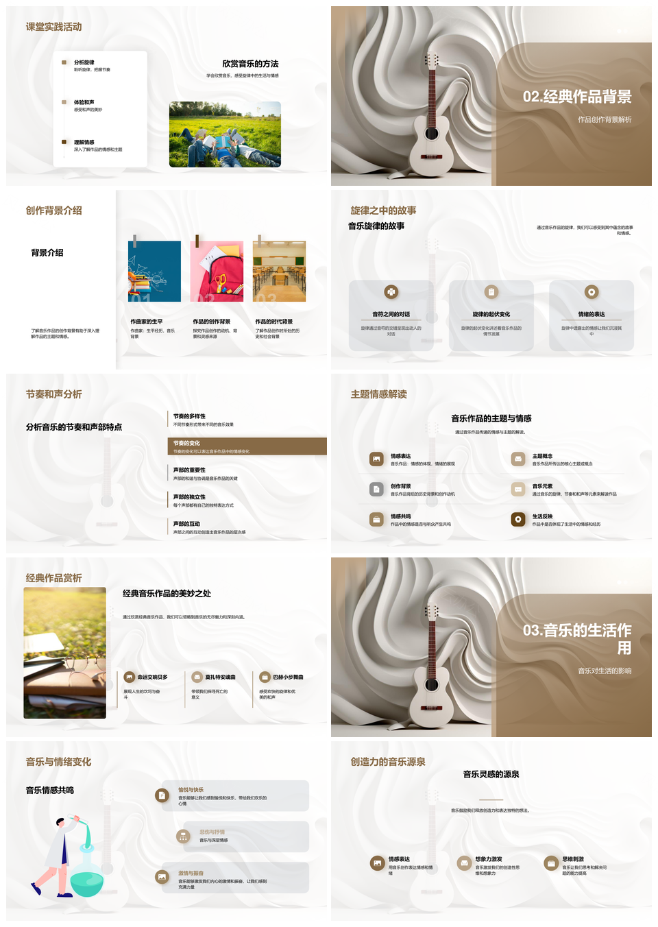 这是一张音乐之旅静心聆听艺术生活旋律节奏符号PPT模板,包含音乐之旅、静心聆听、艺术生活、旋律、节奏、符号等主题内容,也可用作音乐静心聆听艺术、静心聆听艺术生活、艺术生活旋律节奏、生活旋律节奏符号、音乐静心艺术生活、静心艺术生活旋律、艺术旋律节奏符号、音乐静心聆听旋律、静心聆听生活旋律、艺术生活节奏符号、音乐艺术旋律节奏、静心生活节奏符号、旋律节奏符号音乐、音乐静心生活节奏、艺术旋律符号生活等PPT场景使用。 风云办公提供的音乐之旅静心聆听艺术生活旋律节奏符号PPT模板,下载格式为pptx,一共31页,作品中文字及图均可以修改和编辑,图片更改请在作品中右键图片并更换,文字修改请直接点击文字进行修改。