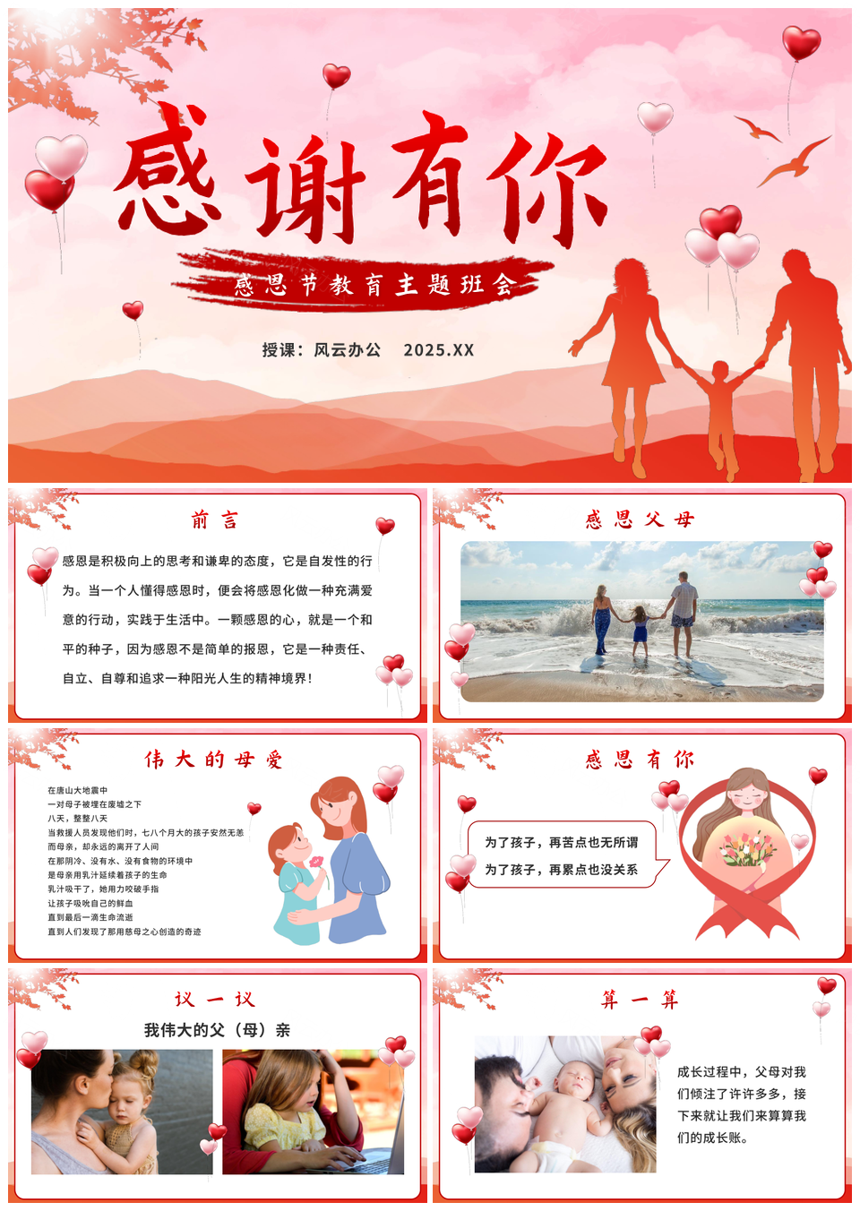 风云办公提供的红色渐变剪影感恩亲子家庭班会课件,下载格式为pptx,一共17页,作品中文字及图均可以修改和编辑,图片更改请在作品中右键图片并更换,文字修改请直接点击文字进行修改。