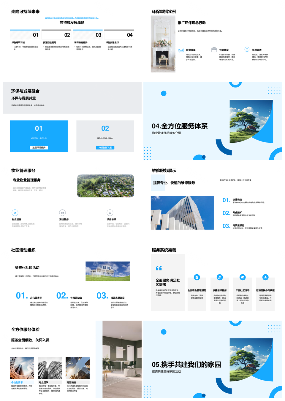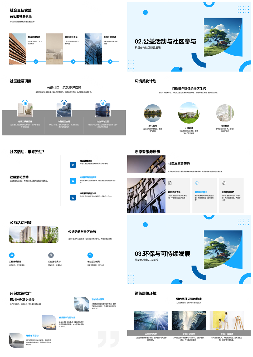 风云办公提供的社区物业共护绿树公益环保可持续发展PPT模板,下载格式为pptx,一共33页,作品中文字及图均可以修改和编辑,图片更改请在作品中右键图片并更换,文字修改请直接点击文字进行修改。