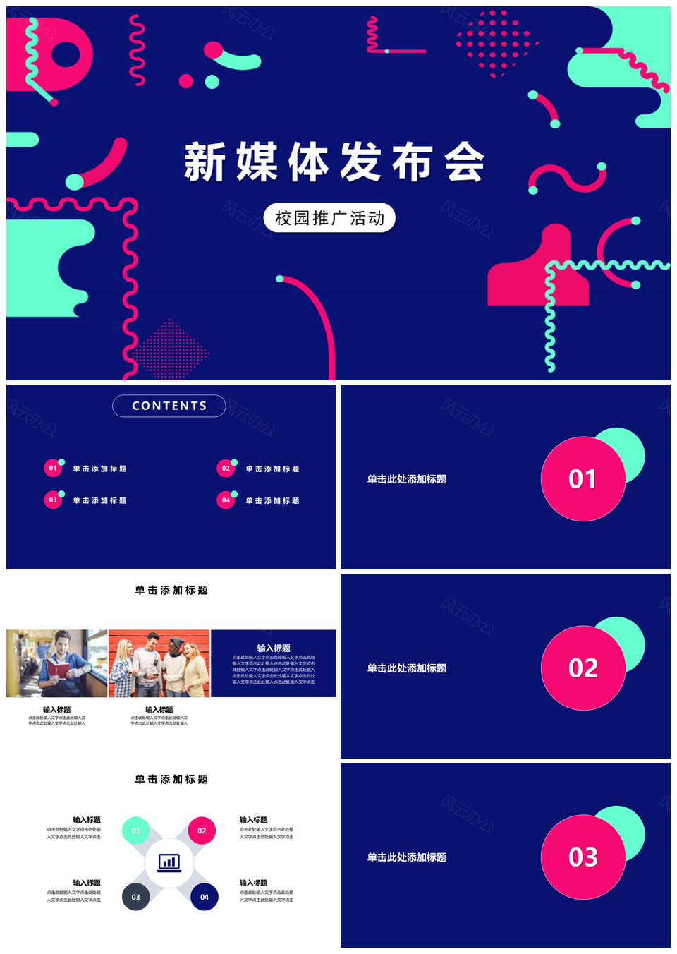 风云办公提供的蓝色新媒体发布会活力时尚青春PPT模板,下载格式为pptx,一共12页,作品中文字及图均可以修改和编辑,图片更改请在作品中右键图片并更换,文字修改请直接点击文字进行修改。