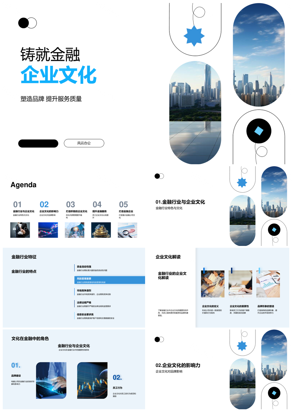风云办公提供的金融企业文化塑品牌优服务提满意PPT模板,下载格式为pptx,一共23页,作品中文字及图均可以修改和编辑,图片更改请在作品中右键图片并更换,文字修改请直接点击文字进行修改。
