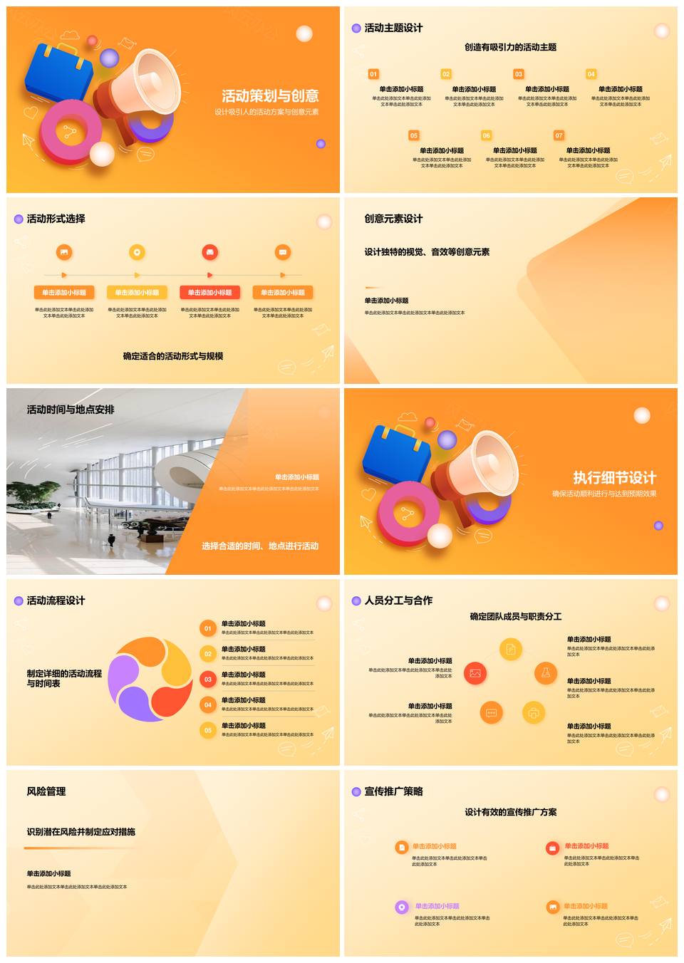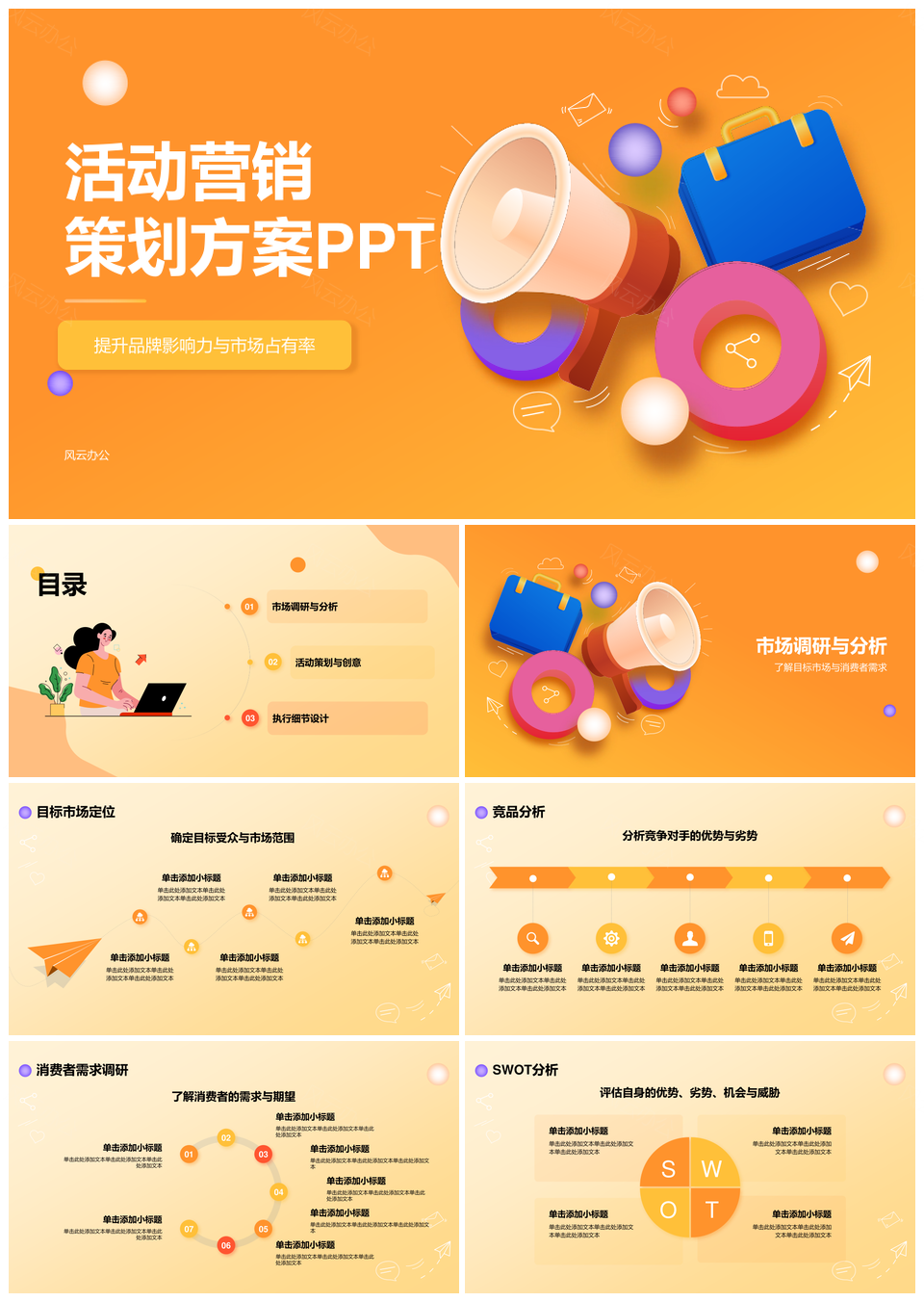 风云办公提供的创意活动营销策划方案调研执行PPT模板,下载格式为pptx,一共18页,作品中文字及图均可以修改和编辑,图片更改请在作品中右键图片并更换,文字修改请直接点击文字进行修改。