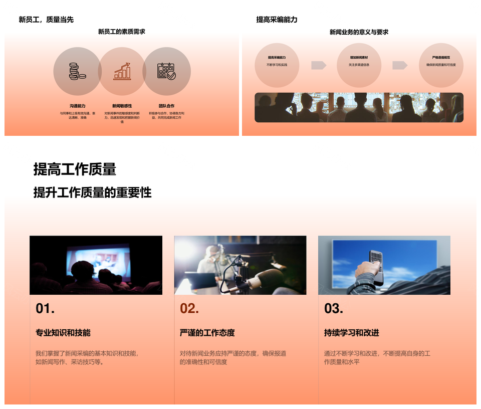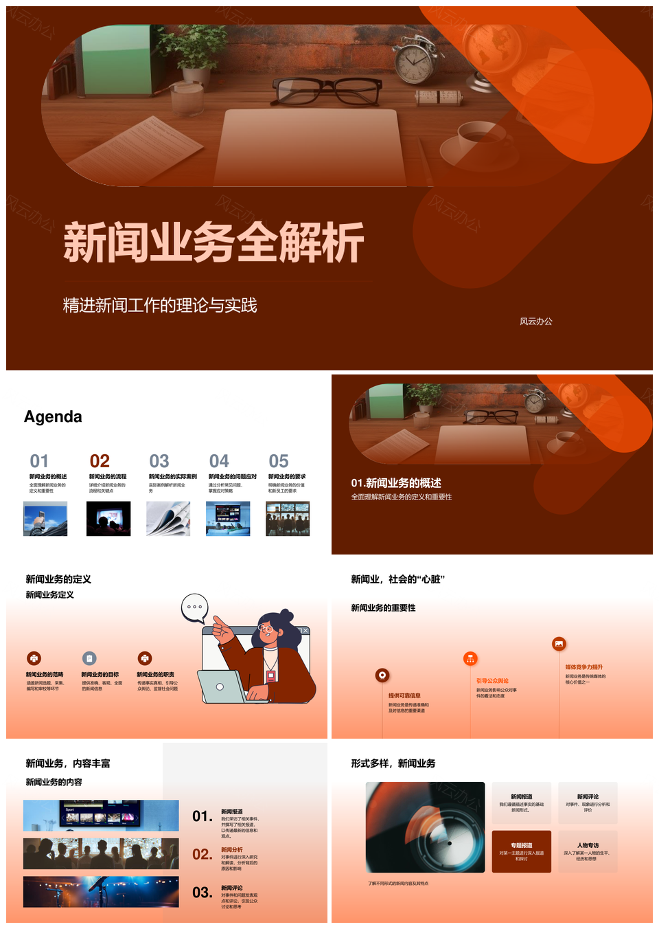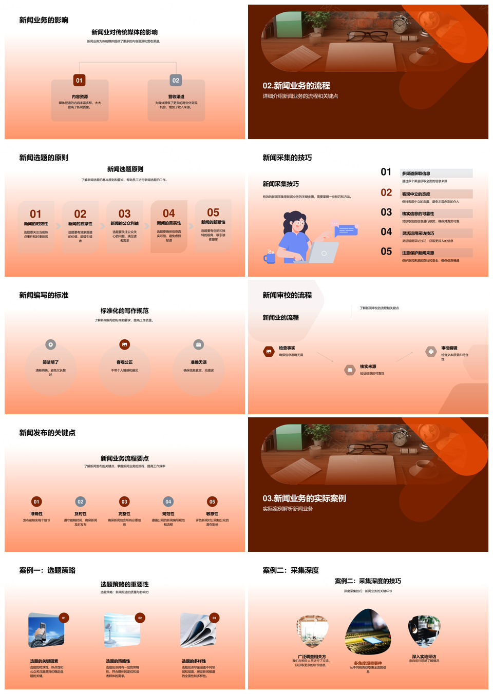这是一张新闻业务流程解析选题采集编写审校发布PPT模板,包含新闻、业务、流程、解析、选题、采集、编写、审校、发布等主题内容,也可用作新闻业务流程解析选题采集、业务流程解析选题采集编写、解析选题采集编写审校、选题采集编写审校发布、新闻业务流程解析选题、业务流程解析选题采集、解析选题采集编写、选题采集编写审校、采集编写审校发布、新闻业务流程解析、业务流程解析选题、解析选题采集、选题采集编写、采集编写审校、编写审校发布等PPT场景使用。 风云办公提供的新闻业务流程解析选题采集编写审校发布PPT模板,下载格式为pptx,一共31页,作品中文字及图均可以修改和编辑,图片更改请在作品中右键图片并更换,文字修改请直接点击文字进行修改。