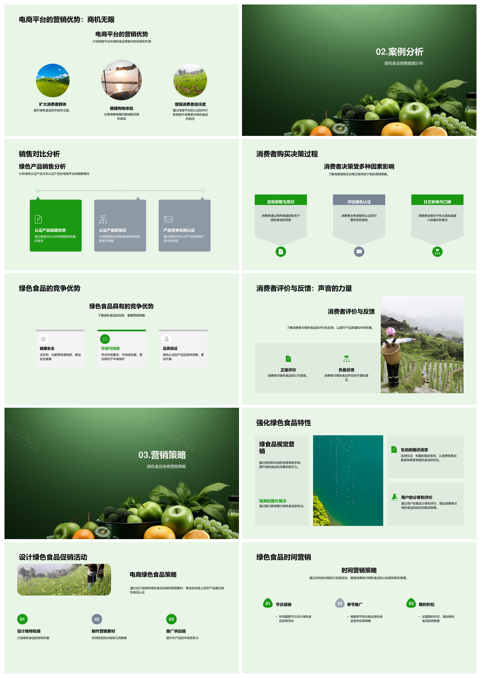 这是一张绿色食品电商营销策略与消费者决策分析PPT模板,包含绿色食品、电商、营销策略、消费者、决策、分析等主题内容,也可用作绿色食品电商营销策略消费者决策分析、绿色食品电商营销策略、电商营销策略消费者决策分析、绿色食品消费者决策分析、绿色食品电商营销策略决策分析、绿色食品电商消费者决策分析、电商营销策略决策分析、绿色食品营销策略决策分析、营销策略消费者决策分析、绿色食品电商消费者、绿色食品营销策略消费者、电商营销策略消费者、电商消费者决策分析、绿色食品电商决策分析、消费者决策分析等PPT场景使用。 风云办公提供的绿色食品电商营销策略与消费者决策分析PPT模板,下载格式为pptx,一共27页,作品中文字及图均可以修改和编辑,图片更改请在作品中右键图片并更换,文字修改请直接点击文字进行修改。
