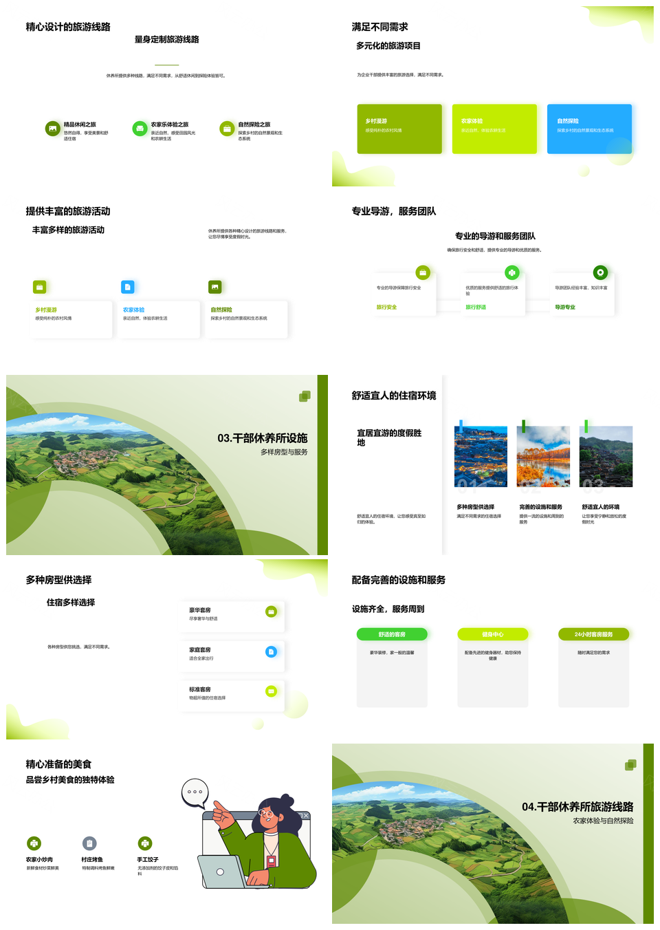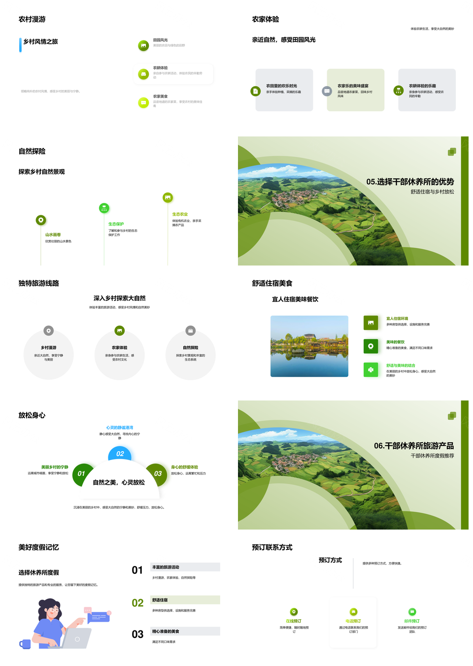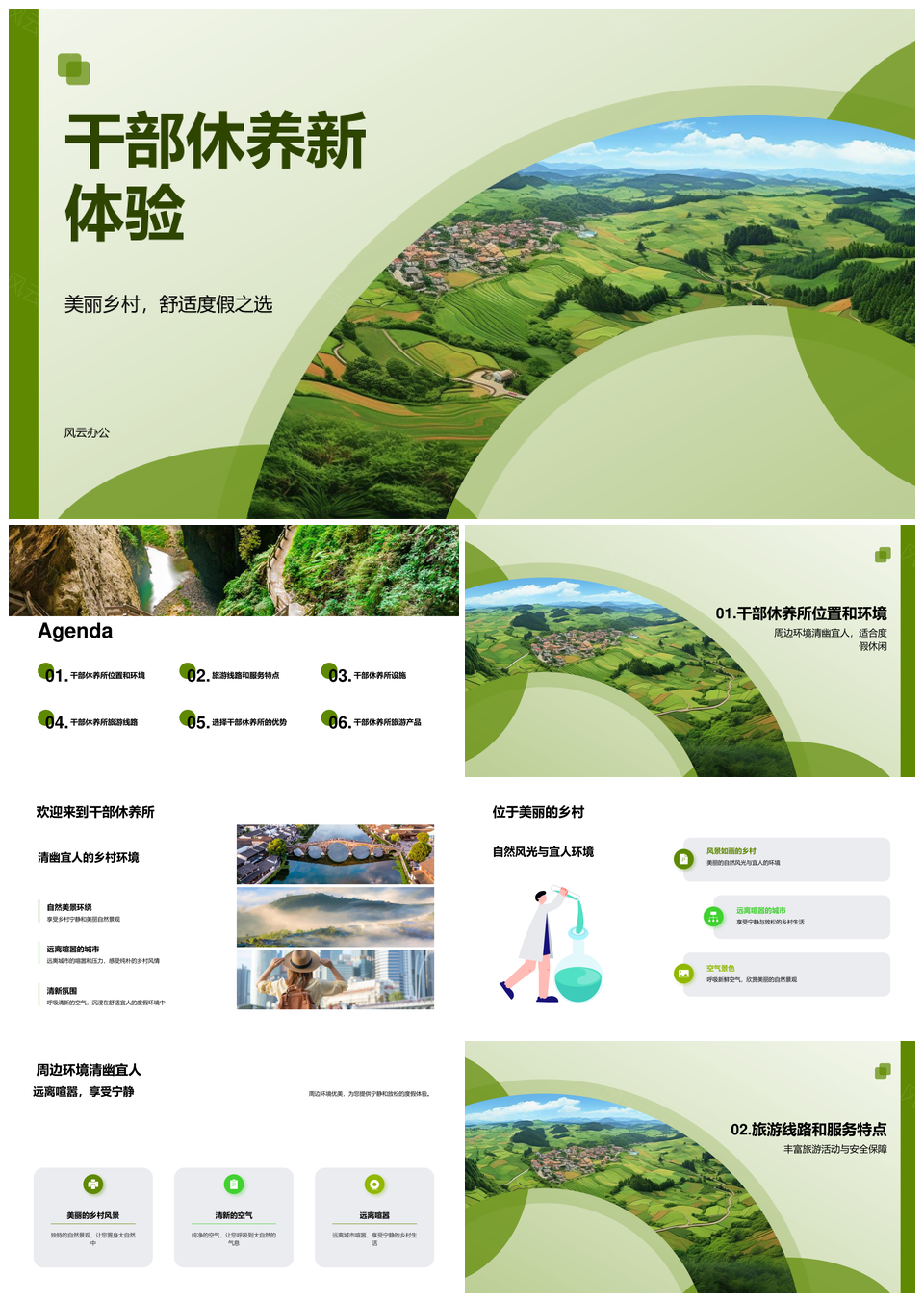 风云办公提供的美丽乡村干部休养自然美食身心之旅PPT模板,下载格式为pptx,一共29页,作品中文字及图均可以修改和编辑,图片更改请在作品中右键图片并更换,文字修改请直接点击文字进行修改。