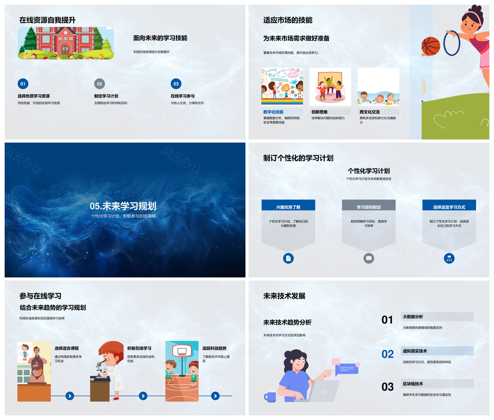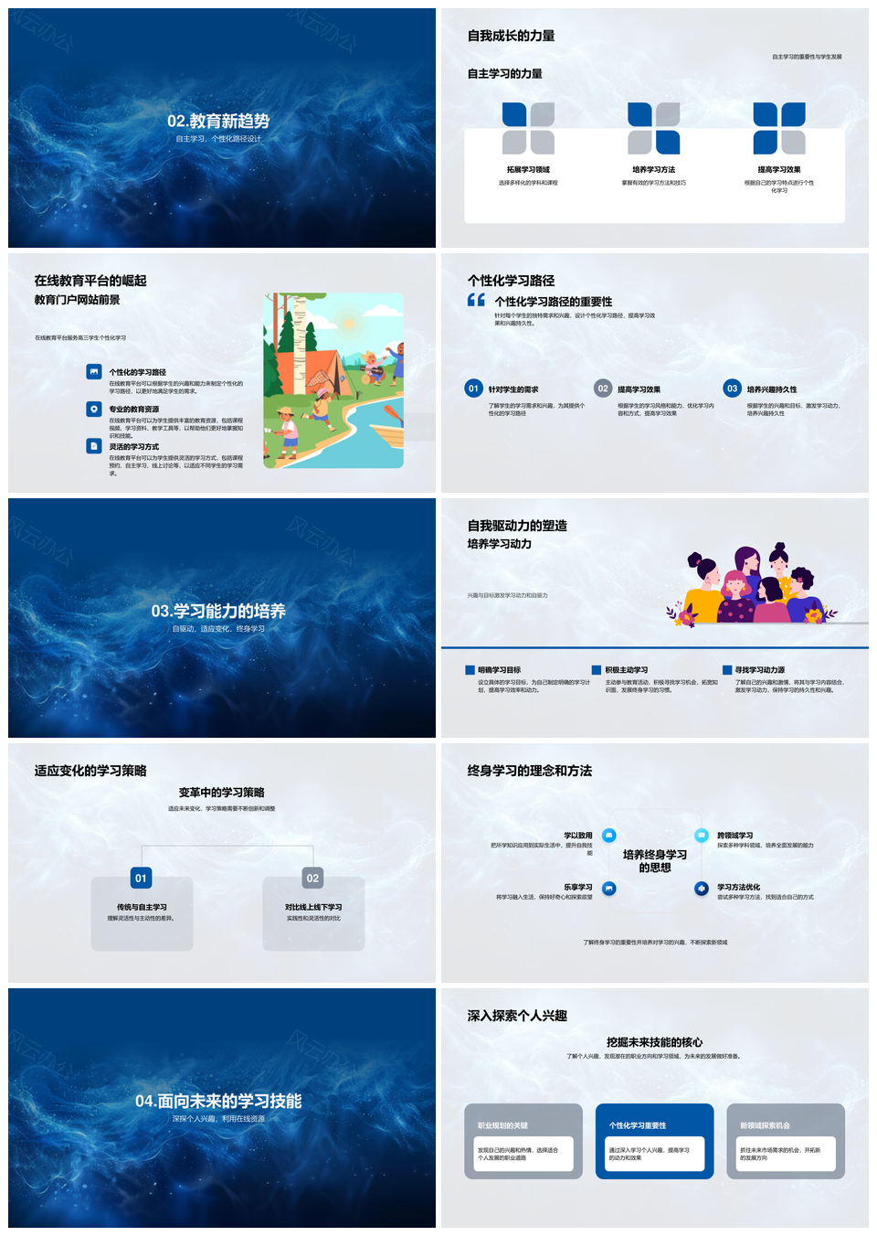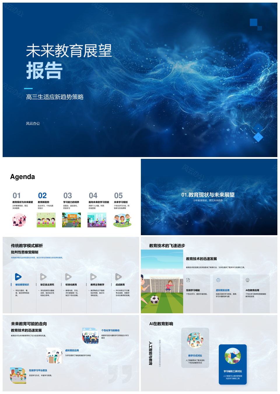 风云办公提供的未来教育展望自主学习力量报告PPT模板,下载格式为pptx,一共24页,作品中文字及图均可以修改和编辑,图片更改请在作品中右键图片并更换,文字修改请直接点击文字进行修改。
