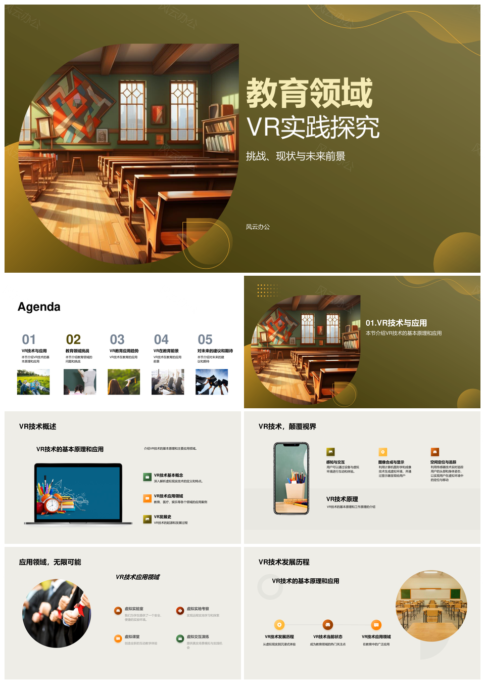 风云办公提供的教育领域VR实践挑战现状与未来前景PPT模板,下载格式为pptx,一共33页,作品中文字及图均可以修改和编辑,图片更改请在作品中右键图片并更换,文字修改请直接点击文字进行修改。