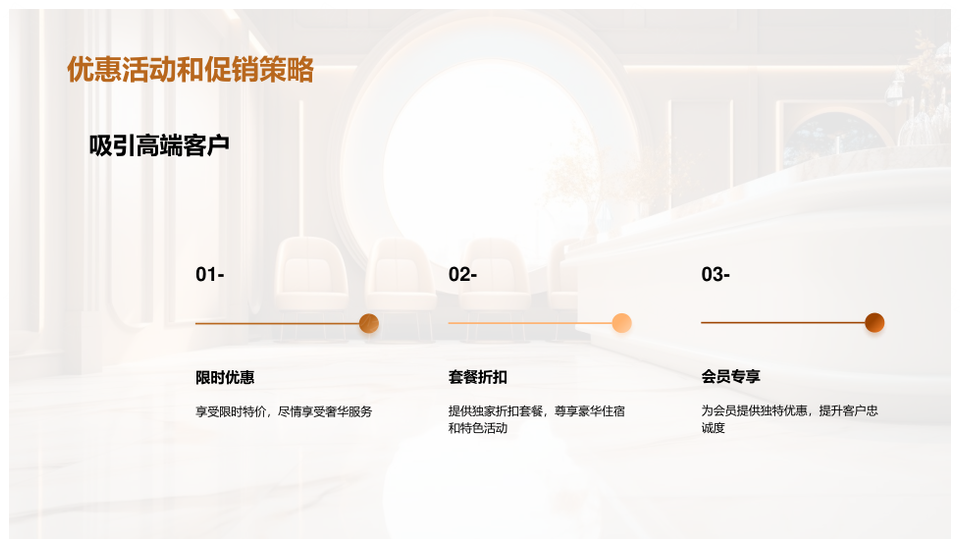 这是一张高端豪华饭店知名旅行社共推奢华服务设施PPT模板,包含高端豪华饭店、知名旅行社、共推、奢华服务设施等主题内容,也可用作高端奢华服务设施、知名旅行社共推奢华、高端豪华服务设施、豪华饭店知名旅行社、共推奢华服务设施、高端豪华饭店、饭店知名旅行社、知名旅行社共推、共推奢华服务、奢华服务设施、高端奢华服务、豪华服务设施、高端豪华、豪华饭店、饭店知名等PPT场景使用。 风云办公提供的高端豪华饭店知名旅行社共推奢华服务设施PPT模板,下载格式为pptx,一共19页,作品中文字及图均可以修改和编辑,图片更改请在作品中右键图片并更换,文字修改请直接点击文字进行修改。