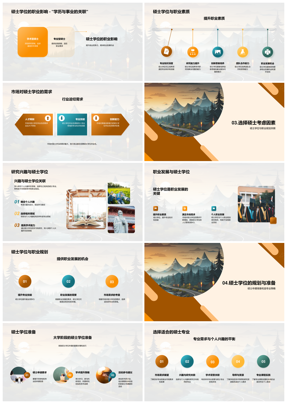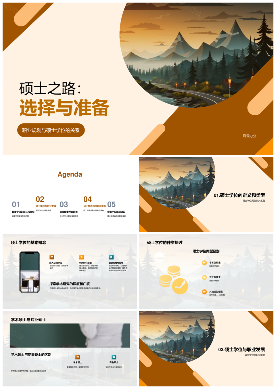风云办公提供的硕士类型选择与职业规划准备PPT模板,下载格式为pptx,一共23页,作品中文字及图均可以修改和编辑,图片更改请在作品中右键图片并更换,文字修改请直接点击文字进行修改。