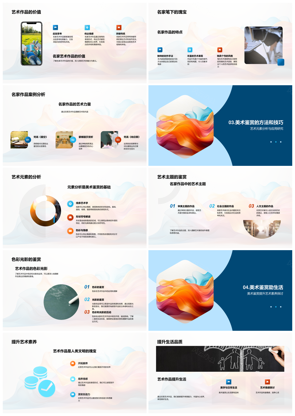 风云办公提供的名家艺术元素鉴赏提升素养品质PPT模板,下载格式为pptx,一共23页,作品中文字及图均可以修改和编辑,图片更改请在作品中右键图片并更换,文字修改请直接点击文字进行修改。