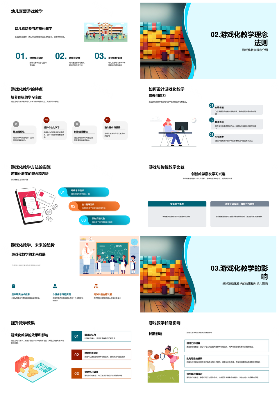 风云办公提供的幼儿游戏化教学设计与学习动力提升PPT模板,下载格式为pptx,一共33页,作品中文字及图均可以修改和编辑,图片更改请在作品中右键图片并更换,文字修改请直接点击文字进行修改。