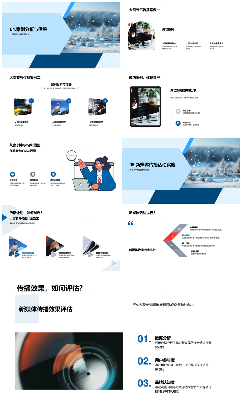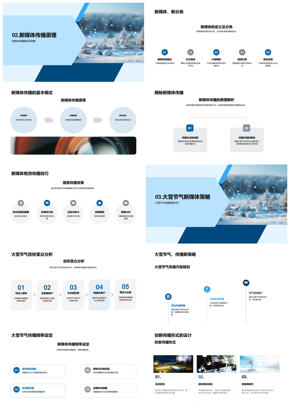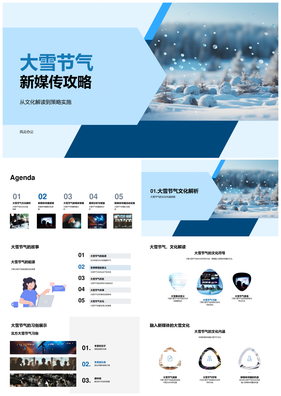 风云办公提供的大雪节气新媒体文化传播策略解码PPT模板,下载格式为pptx,一共27页,作品中文字及图均可以修改和编辑,图片更改请在作品中右键图片并更换,文字修改请直接点击文字进行修改。