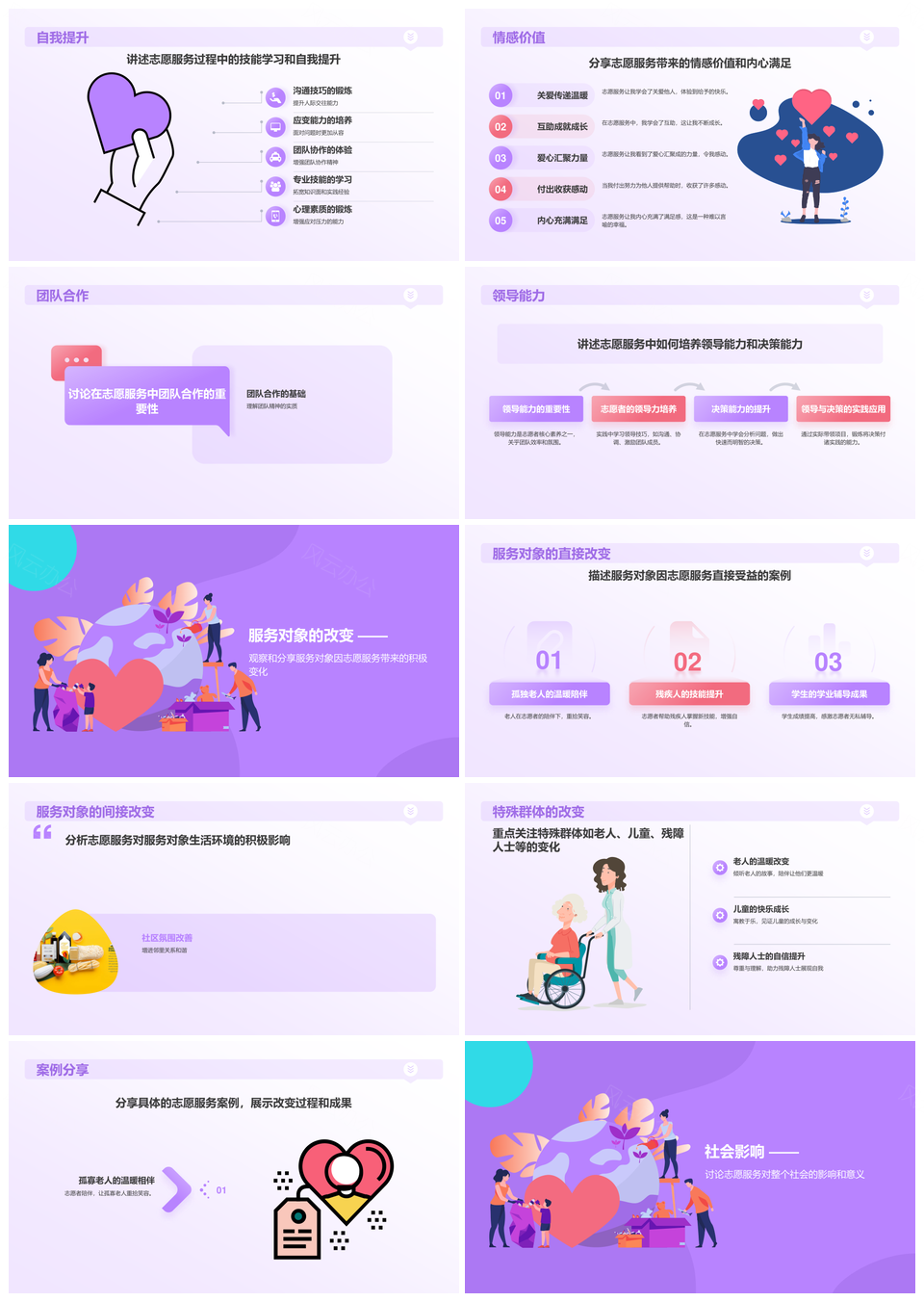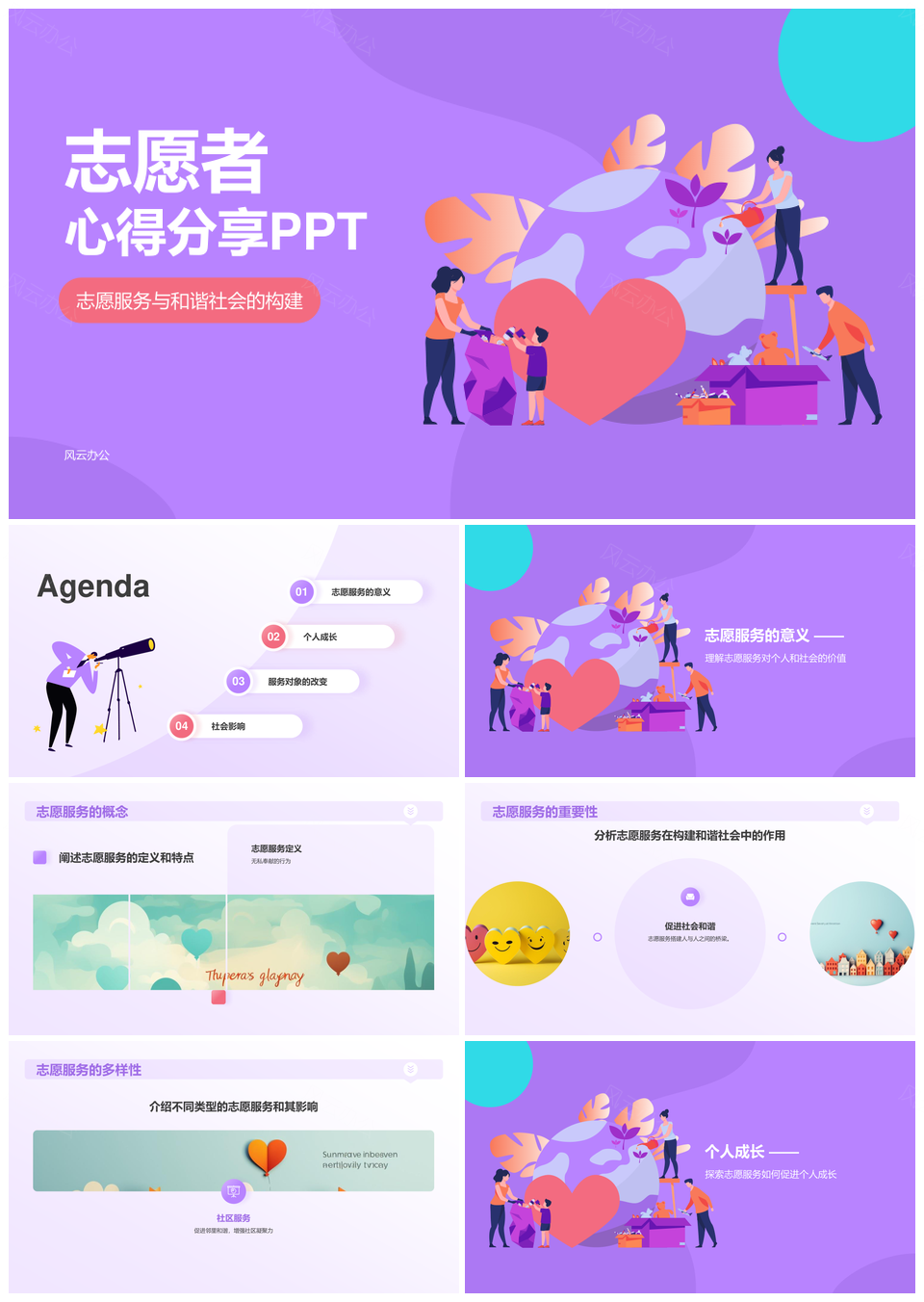 风云办公提供的紫绘志愿同行慈善平等健康多样爱相伴PPT模板,下载格式为pptx,一共22页,作品中文字及图均可以修改和编辑,图片更改请在作品中右键图片并更换,文字修改请直接点击文字进行修改。