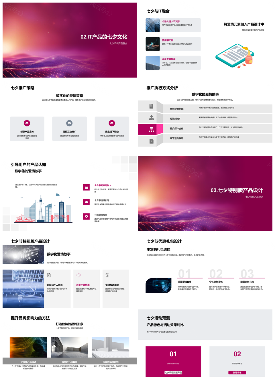 这是一张七夕IT营销文化融合优体验几何格子礼包PPT模板,包含七夕、IT、营销、文化、融合、优体验、几何格子、礼包等主题内容,也可用作七夕IT营销文化融合、七夕IT营销优体验、七夕文化融合礼包、IT营销文化融合、IT营销优体验、文化融合优体验、七夕优体验礼包、七夕几何格子礼包、IT营销几何格子、营销文化融合礼包、优体验几何格子、七夕IT礼包、营销优体验礼包、几何格子礼包、文化融合礼包等PPT场景使用。 风云办公提供的七夕IT营销文化融合优体验几何格子礼包PPT模板,下载格式为pptx,一共28页,作品中文字及图均可以修改和编辑,图片更改请在作品中右键图片并更换,文字修改请直接点击文字进行修改。