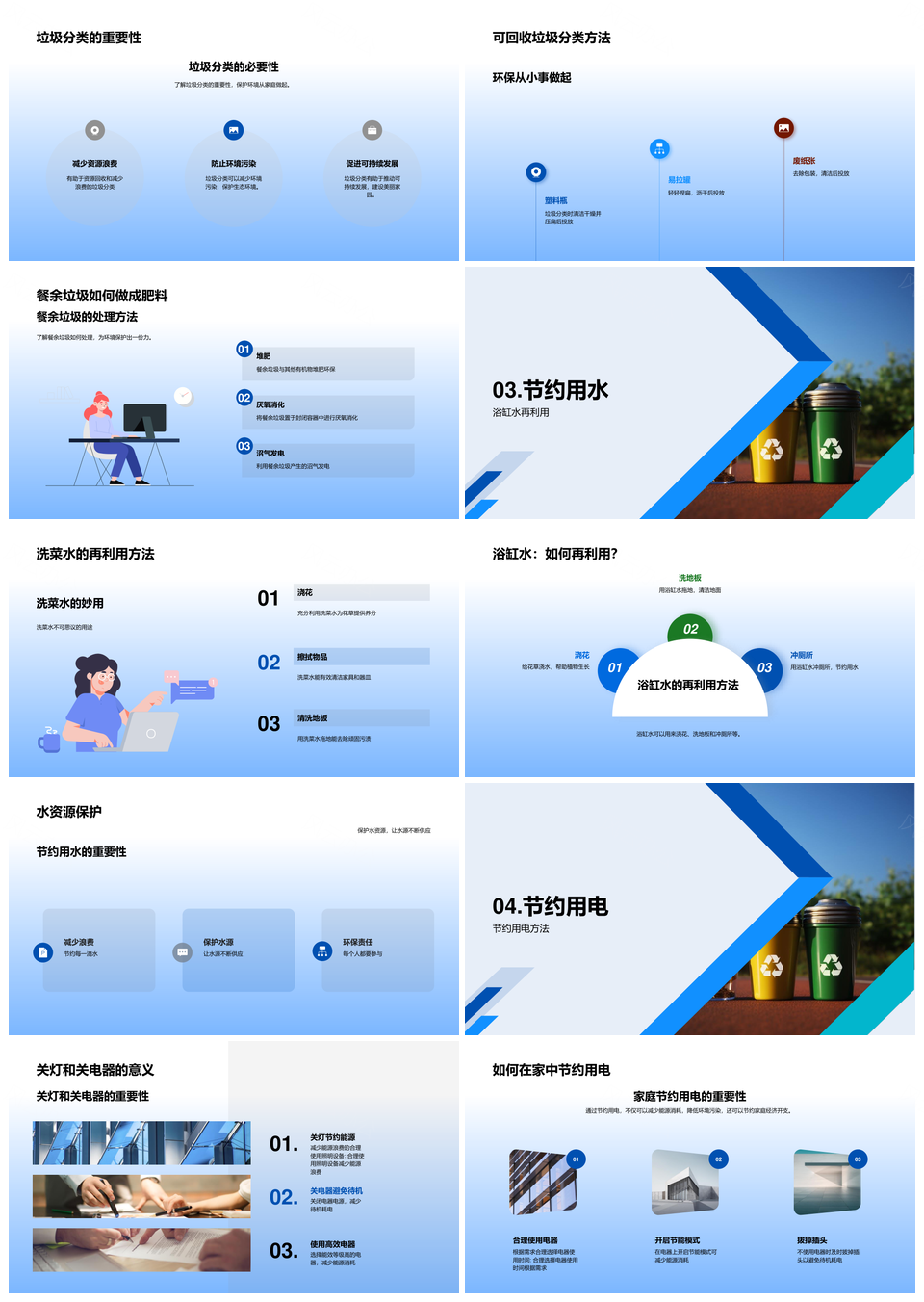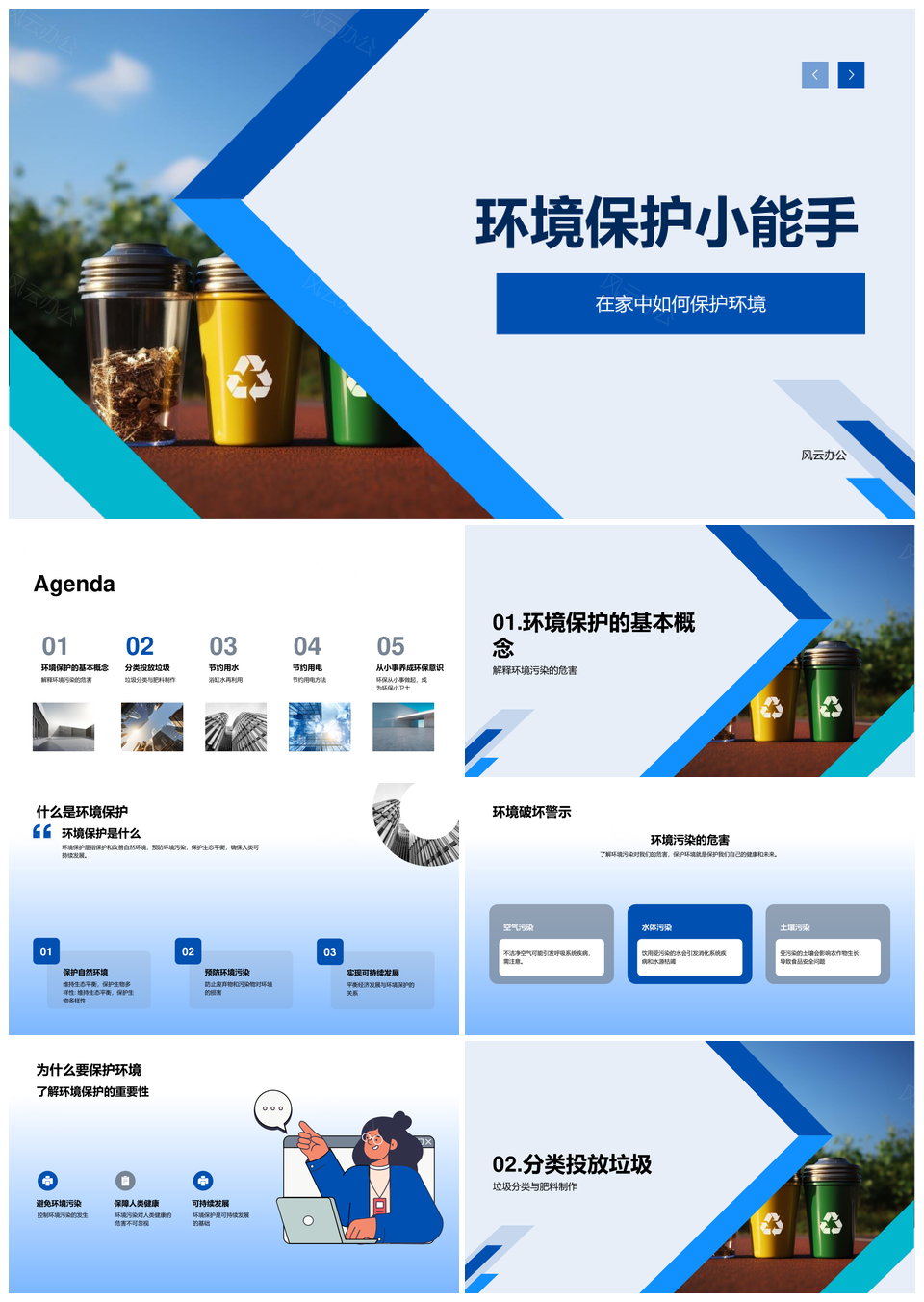 风云办公提供的居家环保小能手分类回收护环境PPT模板,下载格式为pptx,一共23页,作品中文字及图均可以修改和编辑,图片更改请在作品中右键图片并更换,文字修改请直接点击文字进行修改。